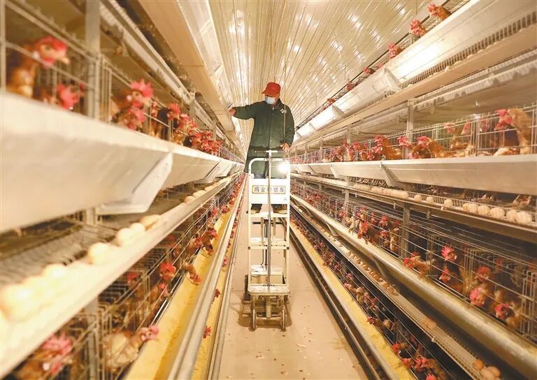 在不远处的分拣区,蛋鸡产出的鸡蛋通过自动传送带精准地输送到这里,村民在自动传送带旁熟练地将鸡蛋打包装箱。“我每天负责的工作就是搞卫生、捡鸡蛋,工作轻松,福利待遇也好。”正在打包装箱的村民叶燕虾说,平时干惯了农活的他对这份“家门口”的工作十分满意。