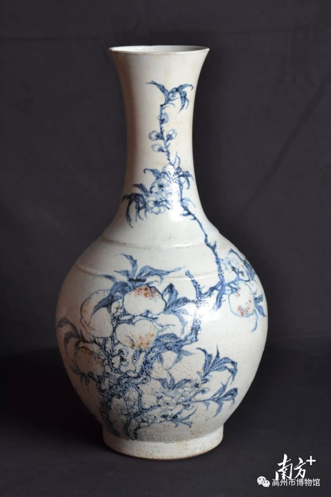 高州府瓷业学堂生产量较小,存世量稀少。图为清代高州窑青花釉里红九桃纹瓶。