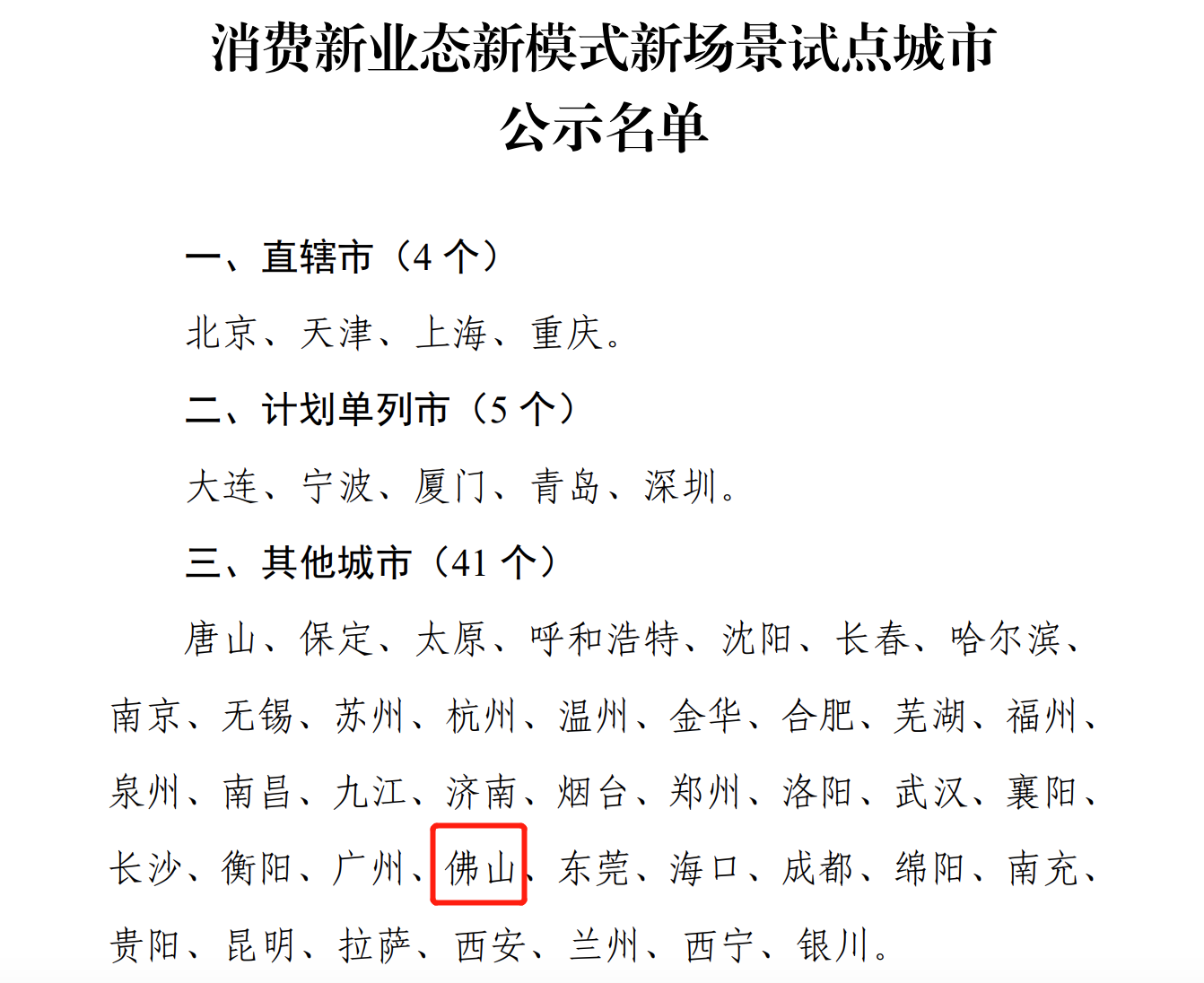 11月20日,财政部、商务部公示消费新业态新模式新场景(下称“三新”)试点城市竞争性评审结果,包括佛山在内,全国共50个城市入选。本次试点城市公示时间为11月20日—28日。