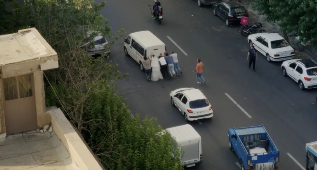 公路片难免会有汽车抛锚的桥段,一行人下来推车,包括穿着婚纱的新娘。由于是长焦偷拍,不明所以的路人也加入了推车的行列。