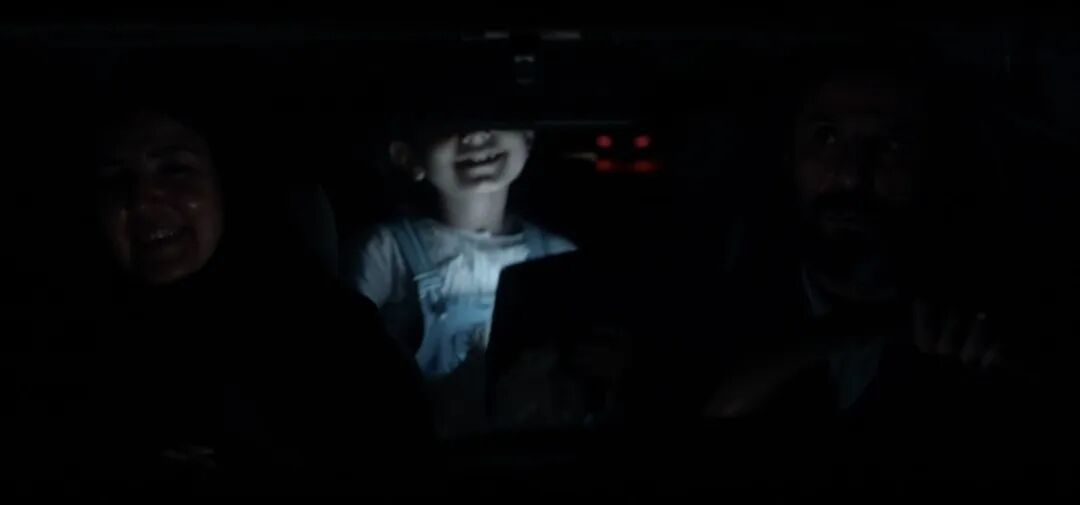 影片开场是在一个夜晚,独腿边开车边与老婆聊天,在观众没有防备的情况下,小女儿突然出现在后座,又蹦又跳,平板电脑的光从下打到脸上,带着惊悚的味道。