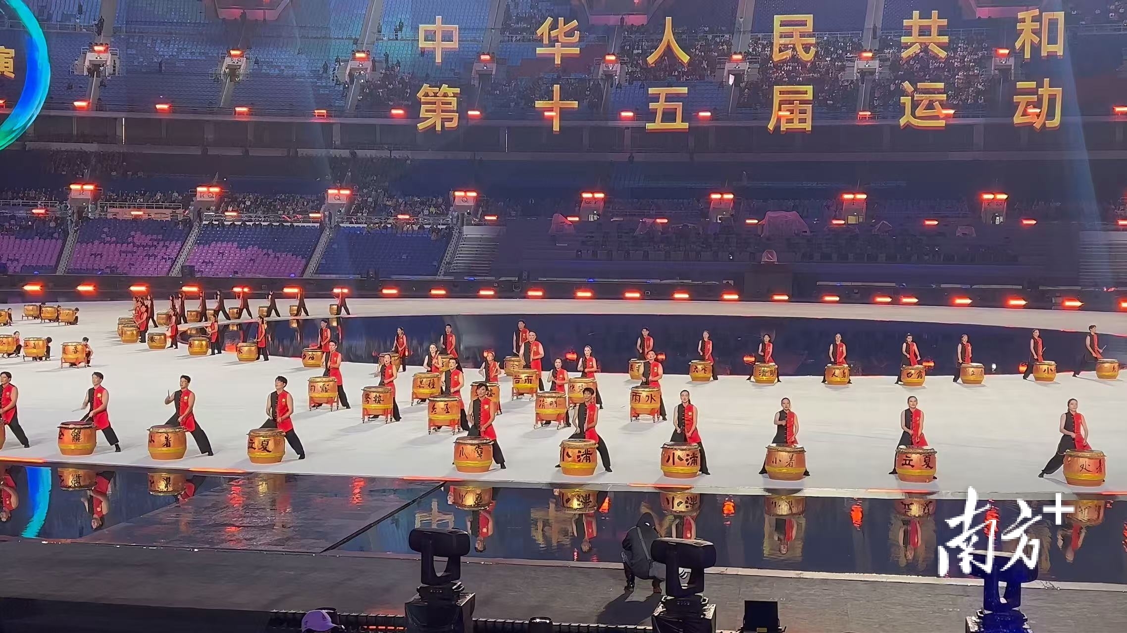 11月9日,第十五届全运会在广州开幕。在暖场节目四个篇章中,潮州二十四节令鼓震撼开场,150名青少年鼓手以青春之鼓擂动传统之声,点燃全运会开幕式现场气氛。