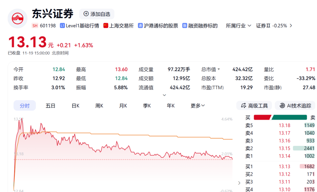 东兴证券实际控制人也是中央汇金投资有限责任公司,公司A股最新市值达424亿元。