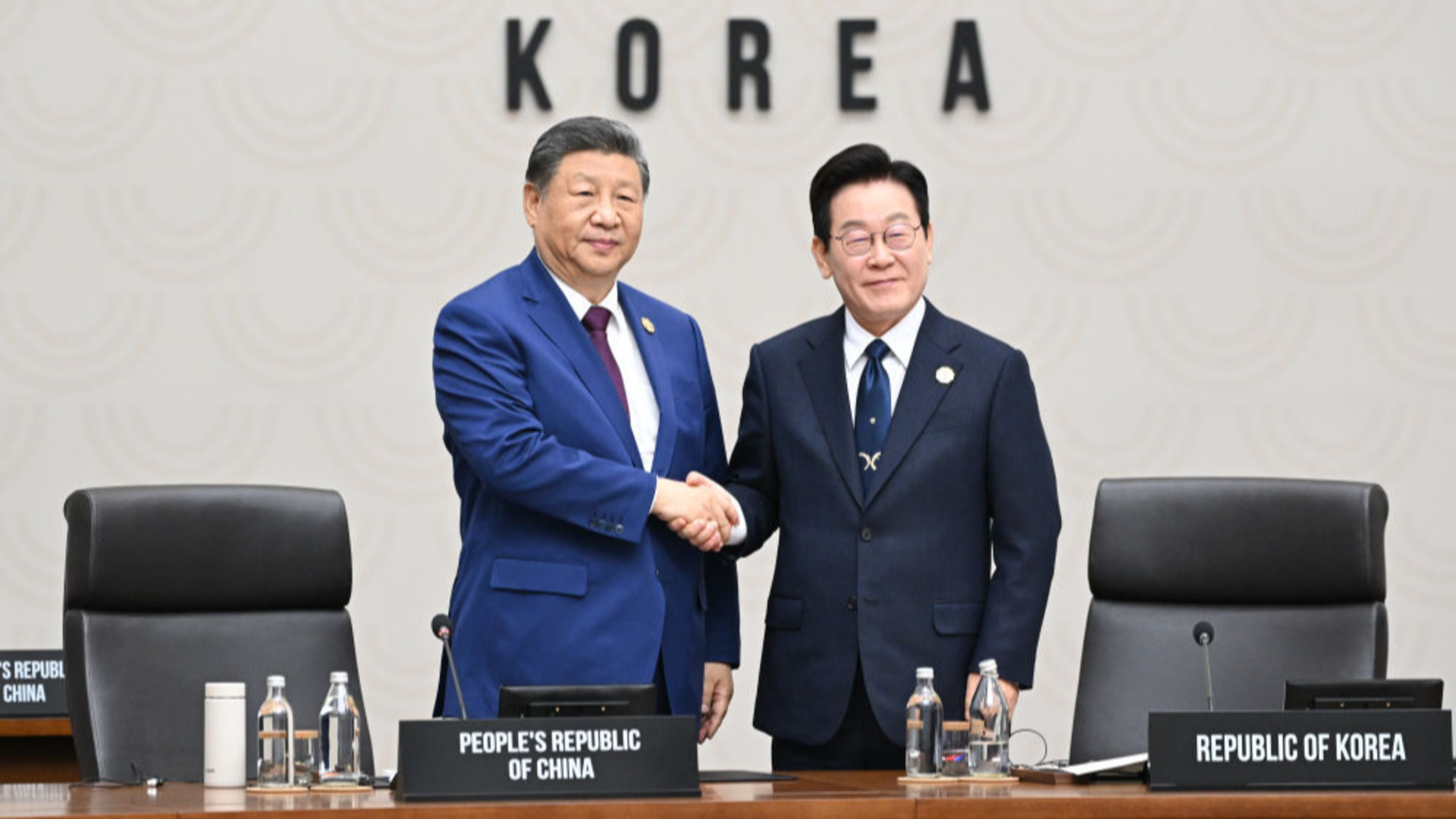 当地时间11月1日上午,国家主席习近平出席亚太经合组织第三十二次领导人非正式会议东道主交接环节,宣布中方将于明年11月在广东省深圳市举办亚太经合组织第三十三次领导人非正式会议。这是习近平同韩国总统李在明在交接环节上握手。新华社记者 谢环驰 摄