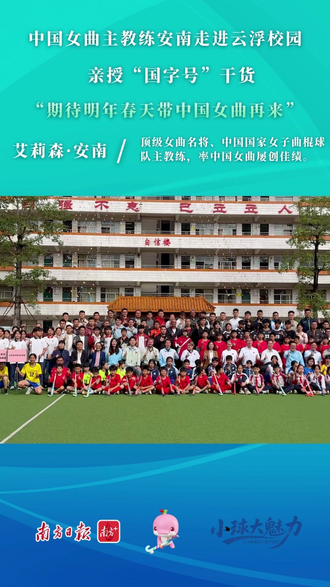 中国女曲主帅安南在云浮校园传技,点赞十五运会曲棍球项目场地