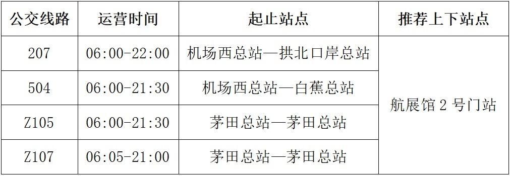乘坐公交车的观众,请在“珠海公交巴士”微信公众号查询线路,可乘坐207、504、Z105、Z107路公交车抵达“航展馆2号门”站,请合理规划换乘路线。