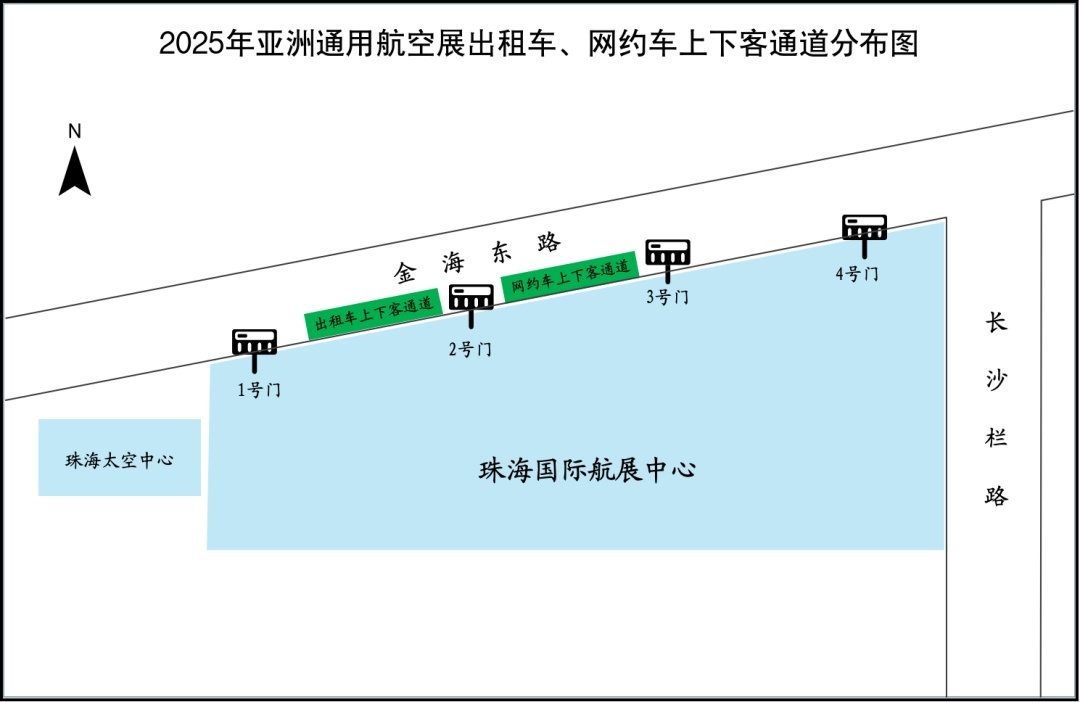 航展中心1号门与2号门之间设立出租车临时上下客通道,在2号门与3号门之间设立网约车临时上下客通道,乘坐出租车或网约车往返展区的观众可在相应通道快速上下车。
