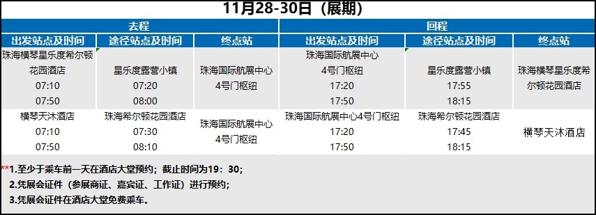 展会主办方为入住指定接待酒店的展商、嘉宾安排了酒店免费穿梭巴士,展商、嘉宾可凭展会证件在指定接待酒店前台登记预约,乘坐酒店免费穿梭巴士往返航展中心4号门。