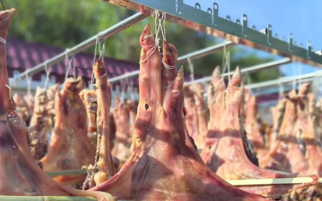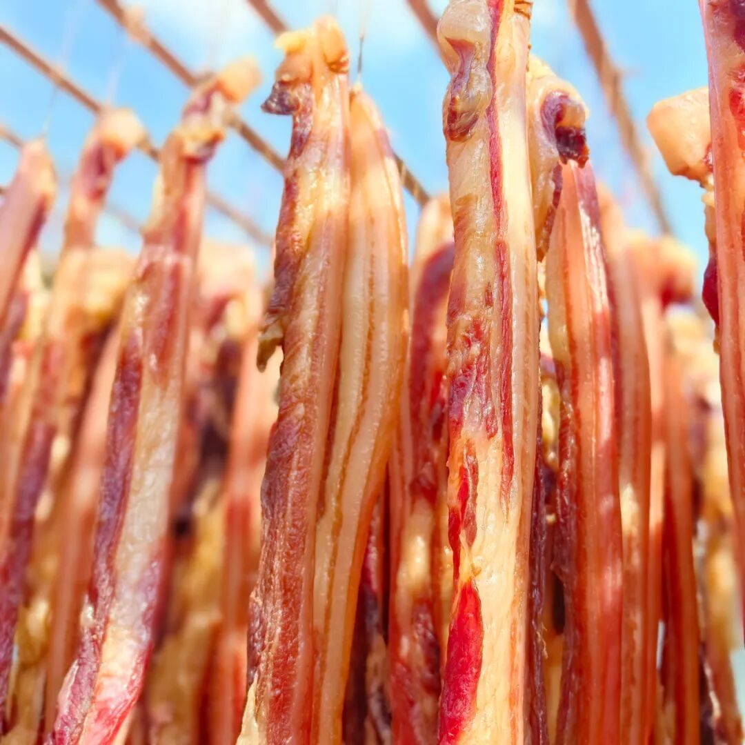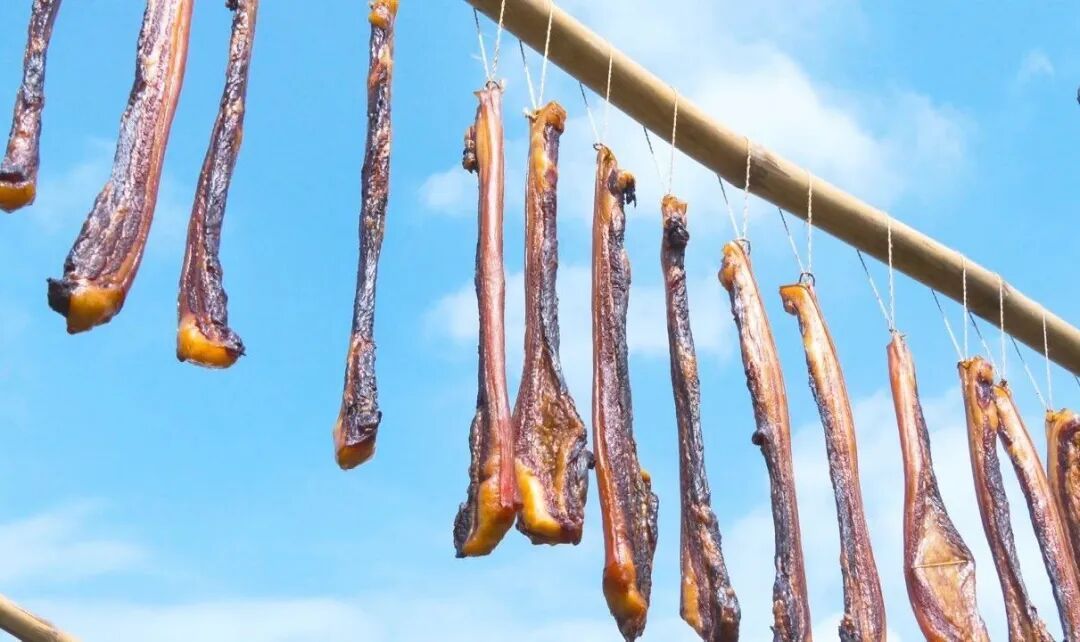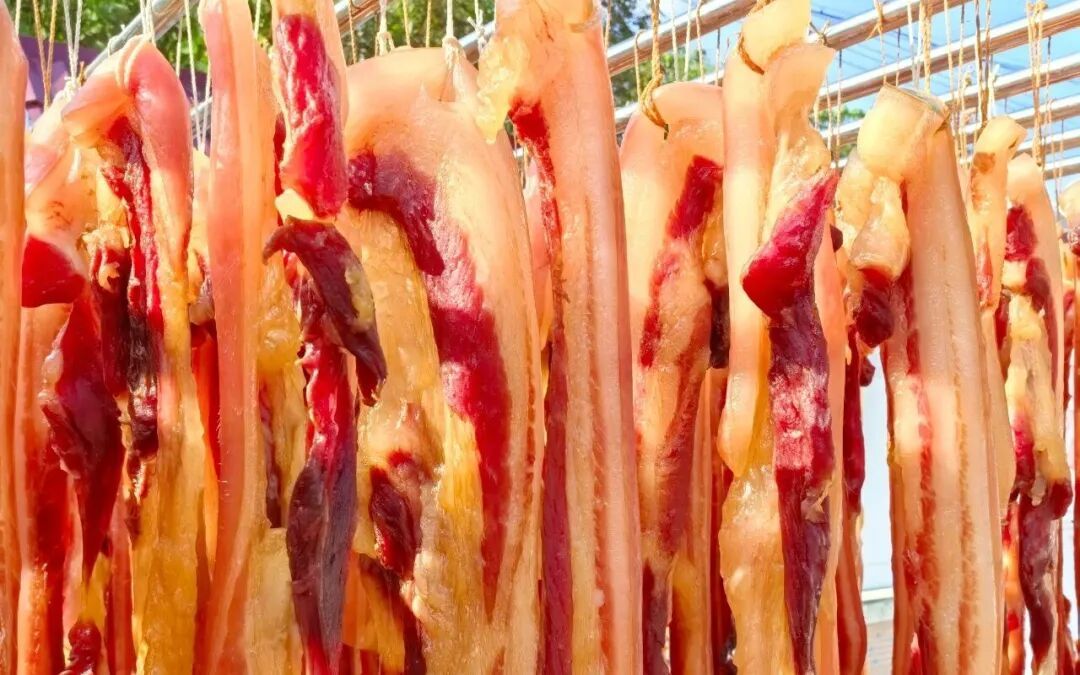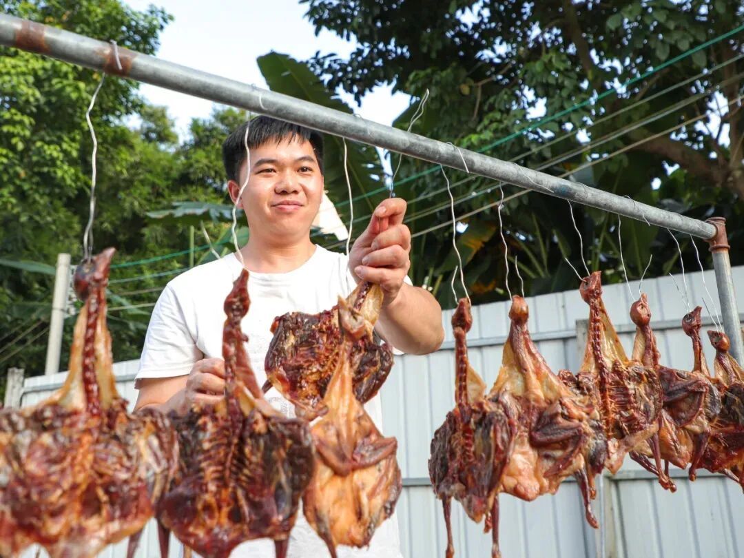 在回龙镇大田塱村,精选的上乘肉鸽经过处理与腌制后,整齐挂上竹竿,静待阳光、温度与风的雕琢。日复一日,原本肥硕的鸽子逐渐收敛,变得肌理紧实,通体油亮。紧实肉质与浓郁腊香,让回龙腊鸽从小众风味,逐渐成为许多食客的心头好。