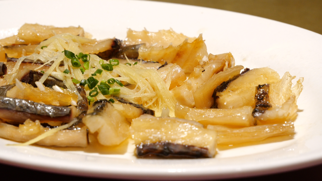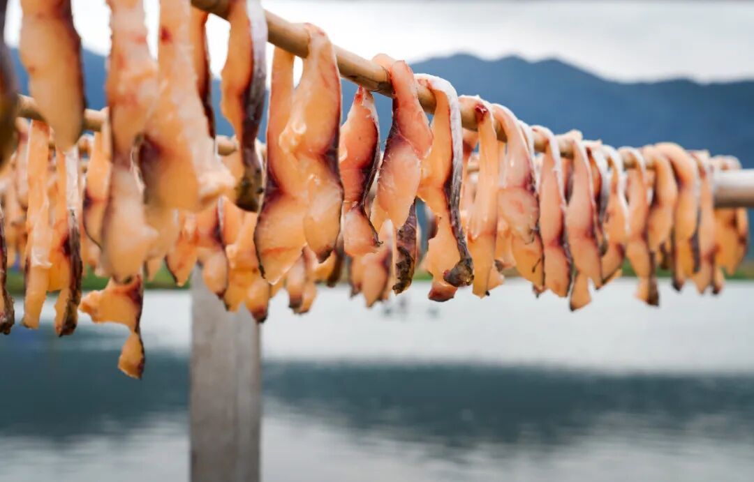 大湾鲩鱼干的制作需要精选十至十二斤的高要本地鲩鱼,肥瘦与油脂比例最为恰当。根据天气状况进行3-4天的风干后,将鱼干放入盐水浸腌,冰箱冷藏4小时,最终在阳光与微风作用下完成最后一次蜕变。