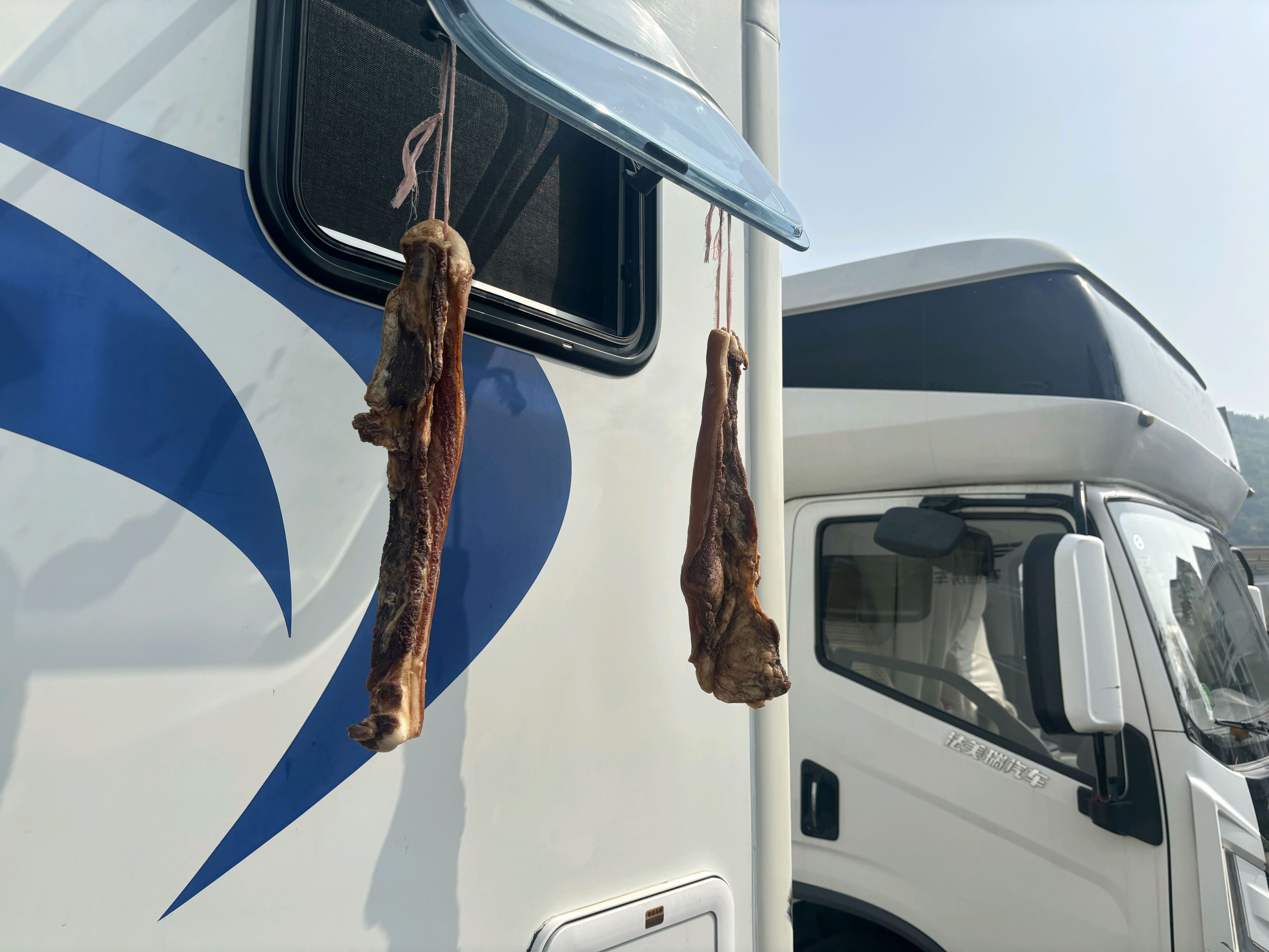 她的丈夫是个讲究人,因为老人喜欢吃腊肉,特意在房车窗户上挂了两块腊肉。“这是不久前在湖南浏阳参加烟花节时买的。”