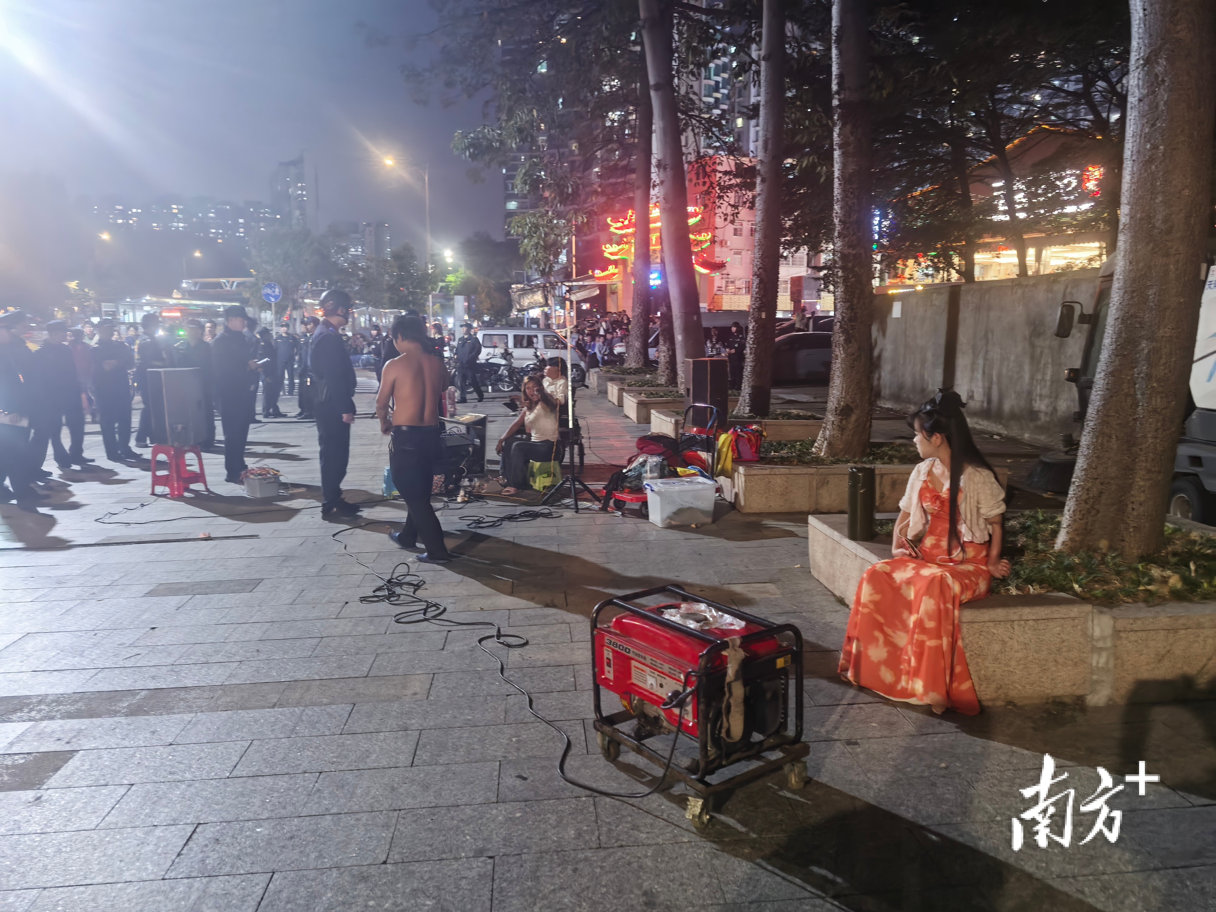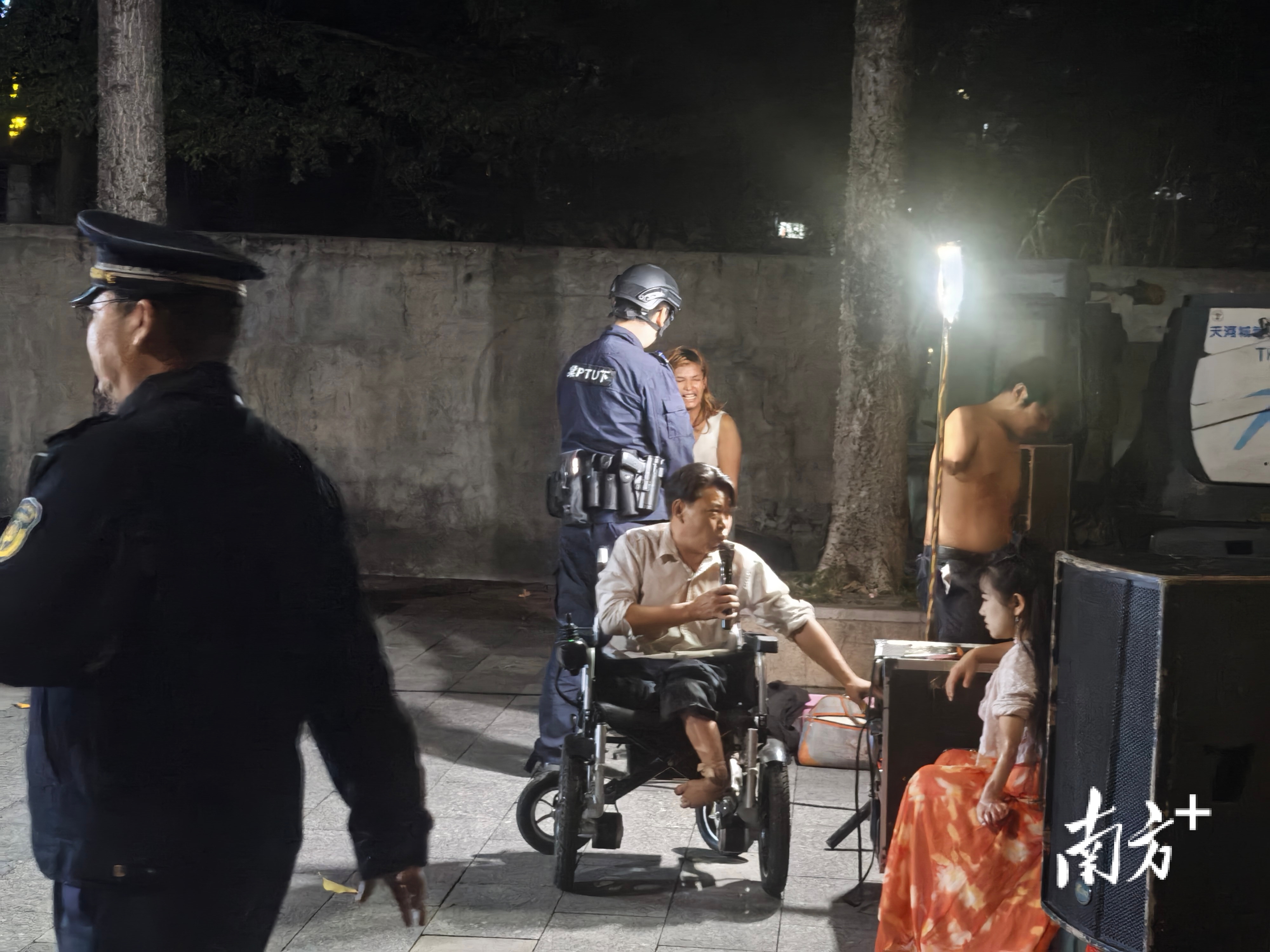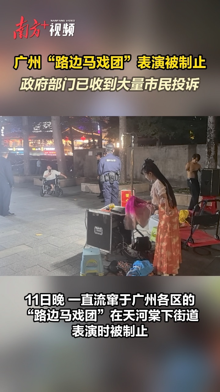 11日晚,一直流窜于广州各区的“路边马戏团”在天河棠下街道表演时被制止。