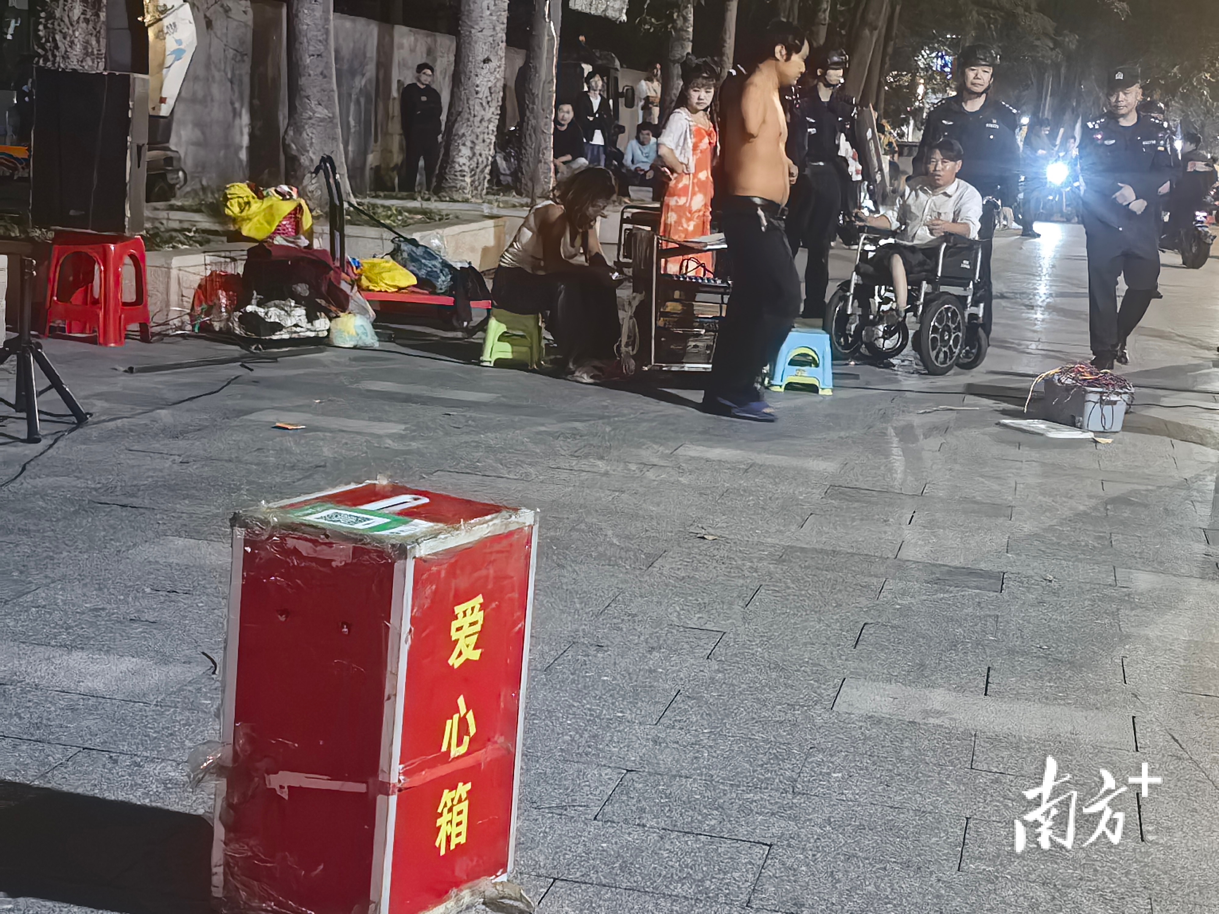 晚上七时许,记者赶到现场,发现演出场地已经转到附近茗苑酒家前面的路边空地上。现场自带发动机,架起了灯光,有两个音箱,两男两女正在表演,其中一名男性坐轮椅,另一人手臂有明显残疾。爱心箱上还有二维码,附近的面包车是贵州车牌。