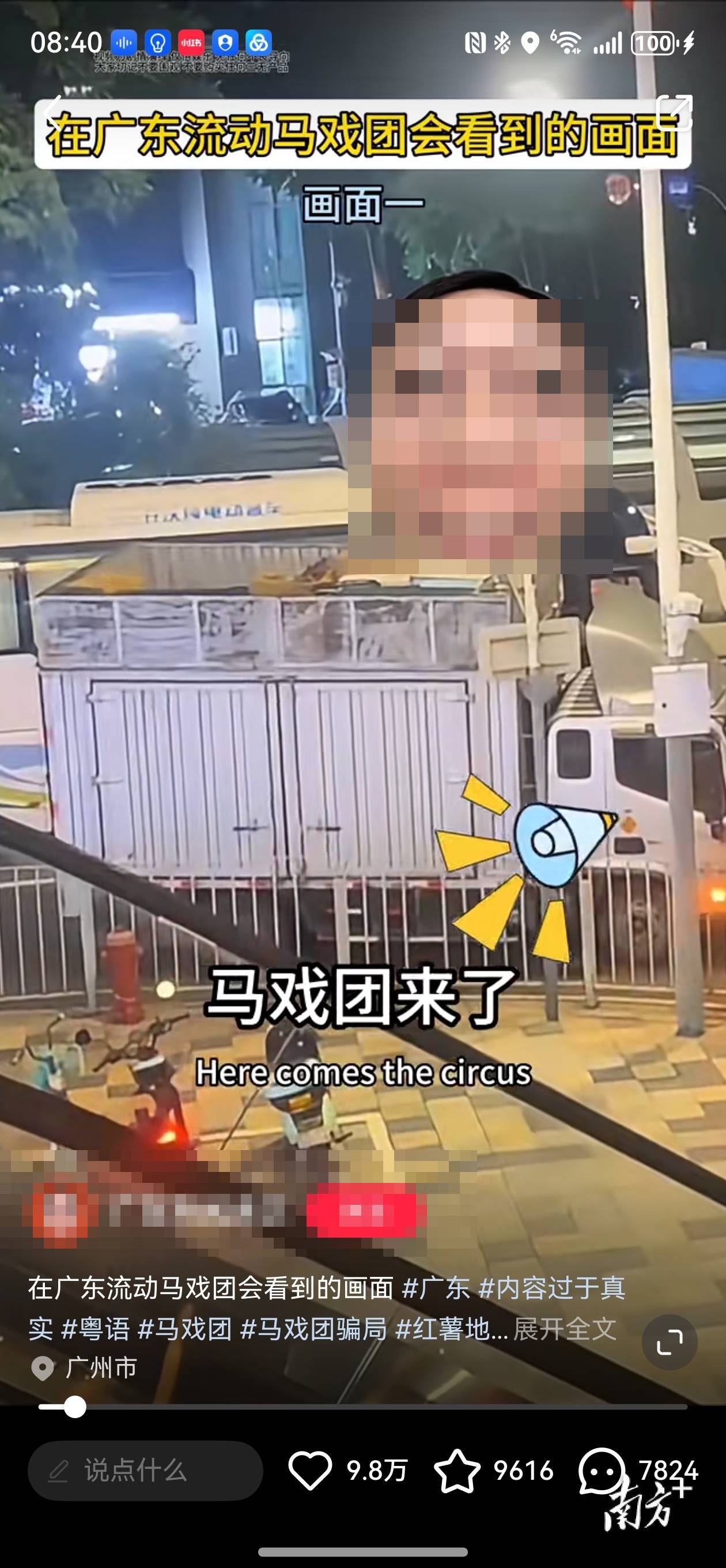 在此之前,南方+已经多次报道路边马戏团的骗术。这些所谓马戏团流窜于广州、深圳、珠海、佛山、东莞等多个城市小区、公园周边,以“免费马戏团表演”为幌子,通常驾驶小货车,通过高音喇叭循环播放“今晚7点,有免费马戏表演”等广告,吸引市民尤其是老年人围观。表演内容多为猴子、蛇、卡皮巴拉等动物的简单互动,以及“鸡腿折断再复原”“手臂脱臼再复位”等虚假戏法,随后借机推销所谓的“祖传药酒”或“特效保健品”,并虚构表演者身世悲惨、需要捐助等情节,诱导观众打赏。