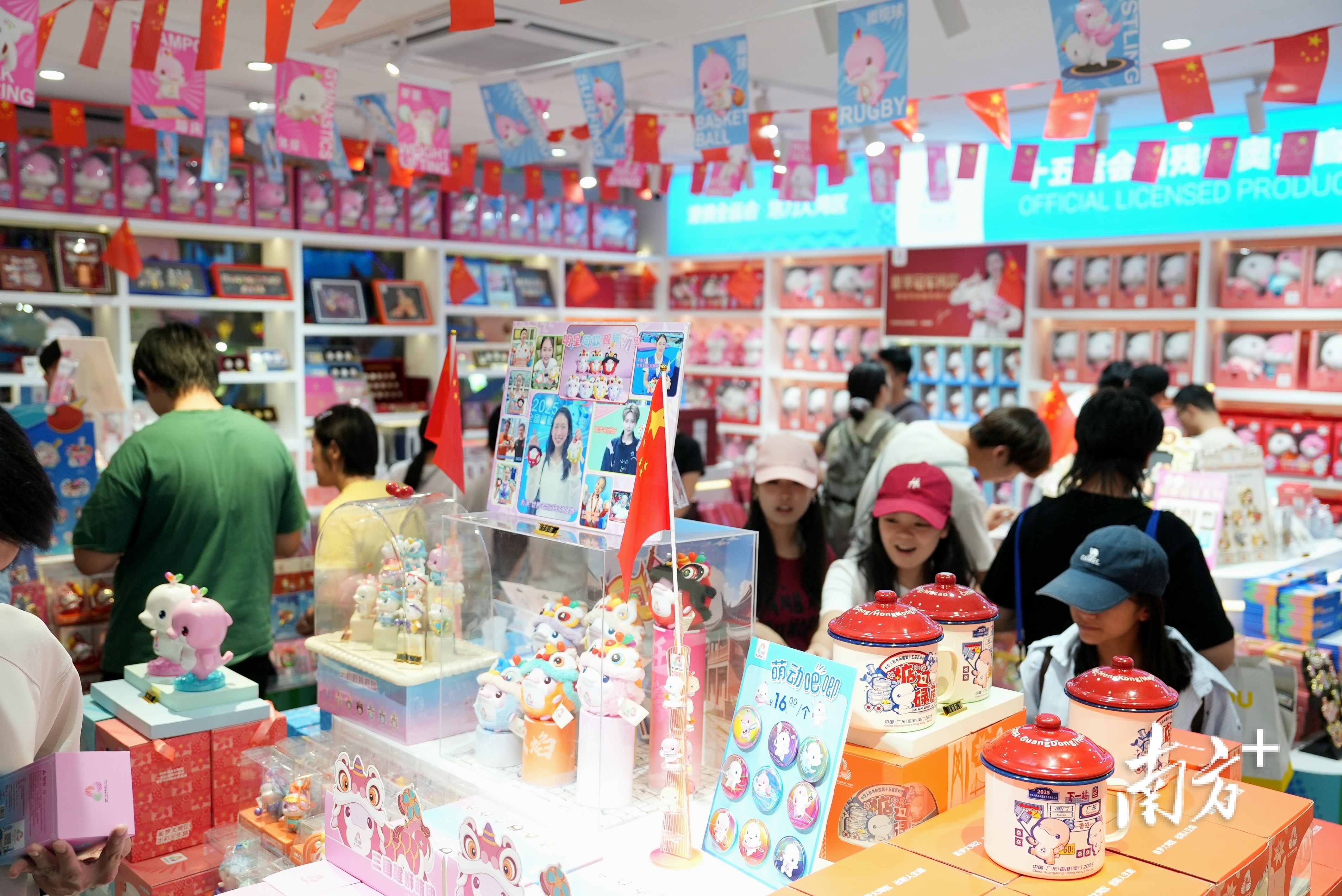 “喜洋洋”“乐融融”网络相关话题阅读量已突破5亿,一跃成为大湾区年度顶流IP。线上的人气也引爆了线下的消费热度。“生肖盲盒”“吹泡泡玩偶”“三国醒狮盲盒”等各类爆款接连出现“断货潮”。截至11月15日,十五运会特许商品销售额已达6.8亿元。