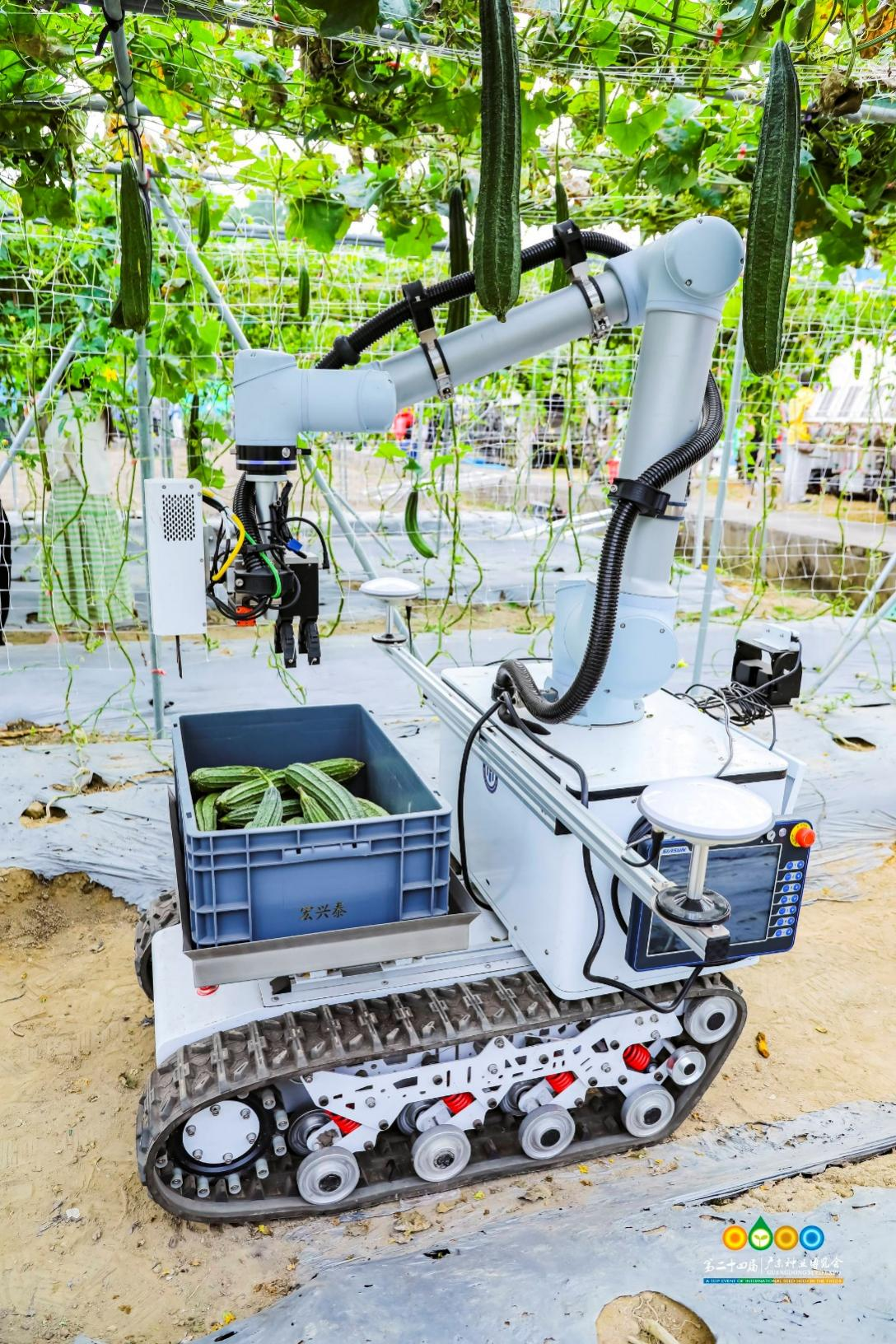 现代农业装备展上,全自动果蔬采收机器人正在演示摘丝瓜。主办方供图