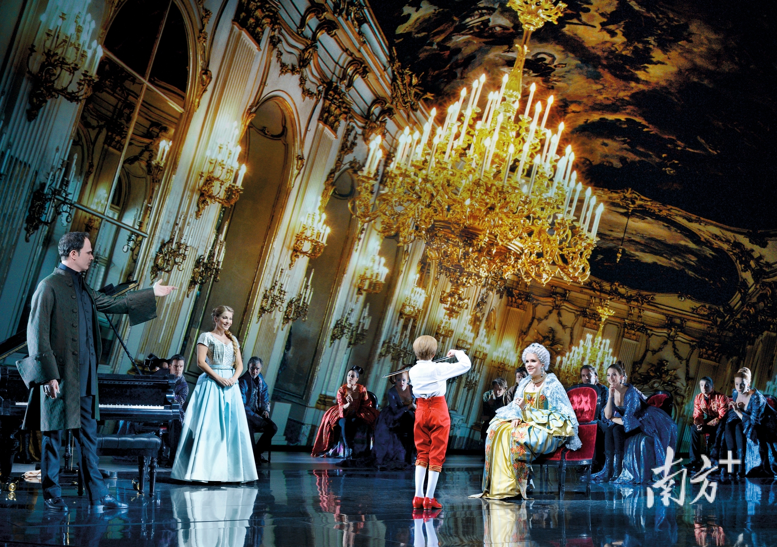 随着剧情推进,这一布景将灵动变幻,从主教的庄严马车到马戏团的神秘魔术台,配合流光溢彩的LED视觉与灯光效果,共同构建出一个既优雅古典又充满现代感的奇幻空间。庞大的管弦乐团全程坐镇舞台,让莫扎特的乐章如潮水般包裹整个剧场,身着维也纳原版演出服装的演员们带领着观众沉浸于洛可可时期的繁华与悸动之中。