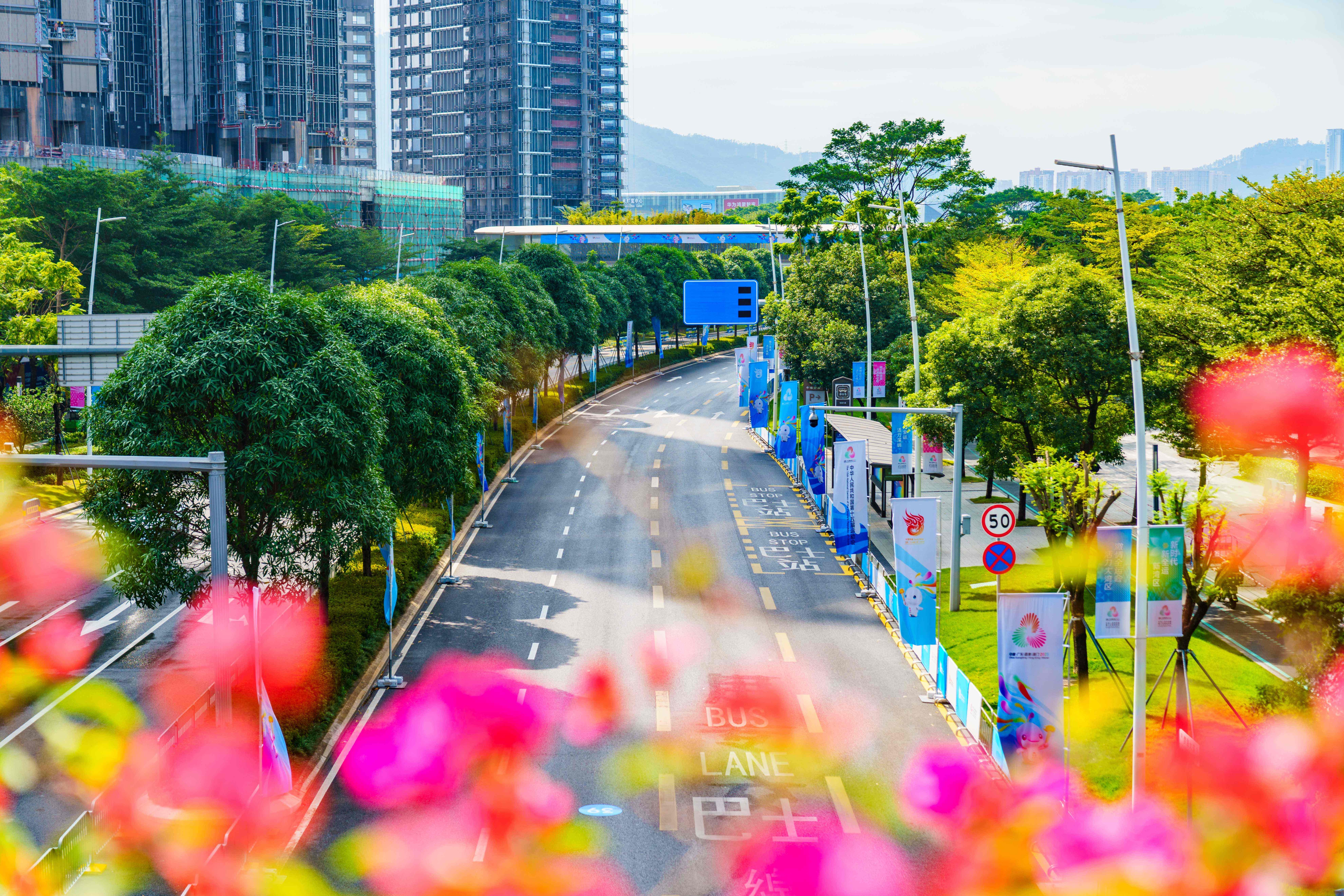 前海商圈的巨型LED屏上,全运会宣传片不断播放;写字楼挂上了全运会海报,就连城市绿化也换上了“全运盛装”——以“同心共筑,花韵流转”为主题、一簇簇色彩交织的花境沿着道路延伸,既像流动的“全运彩带”点缀城市间,又与沿线灯杆旗、吉祥物打卡点形成呼应,随手一拍皆是氛围感大片。