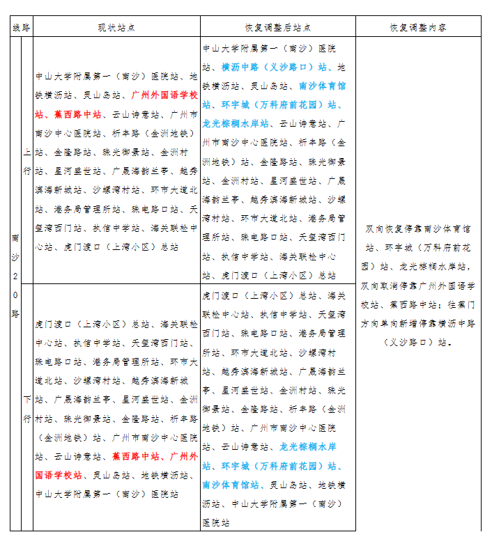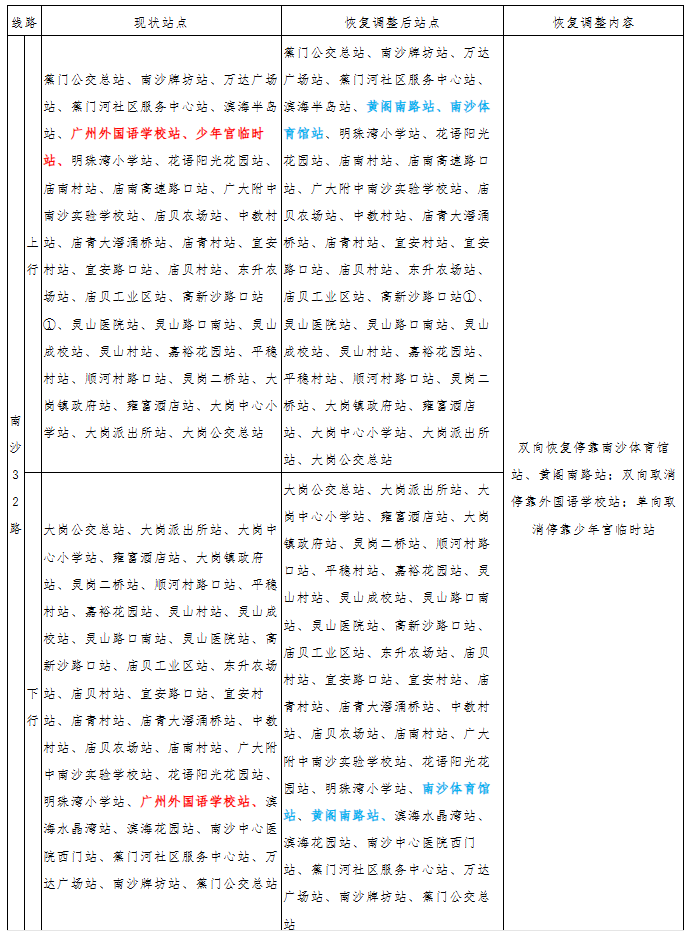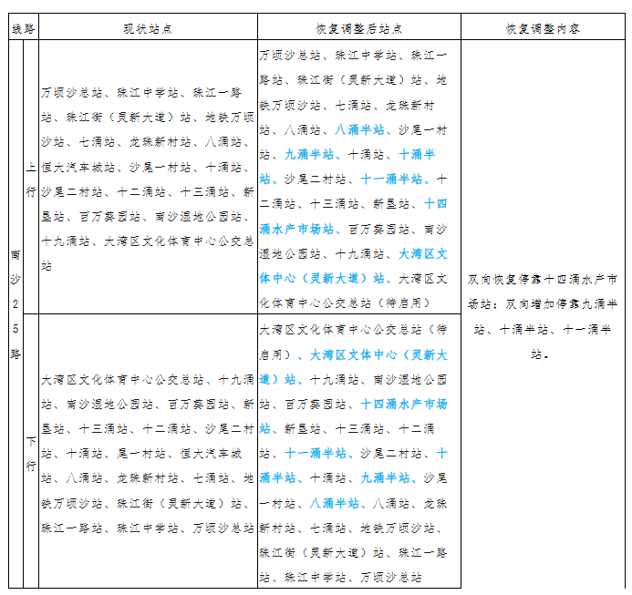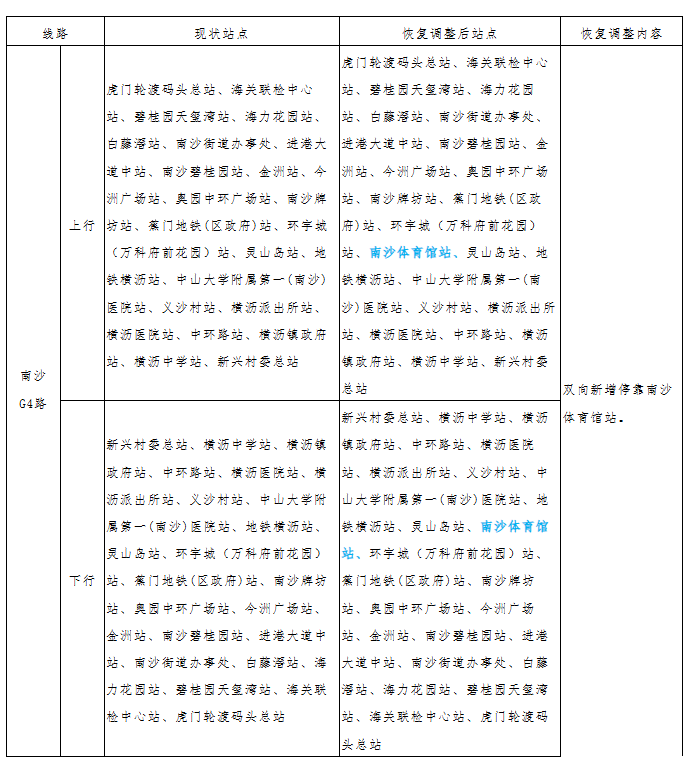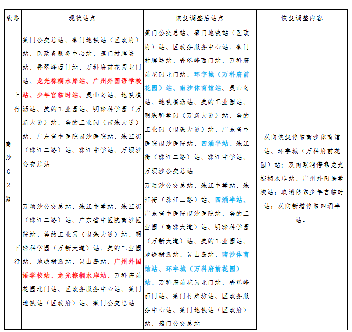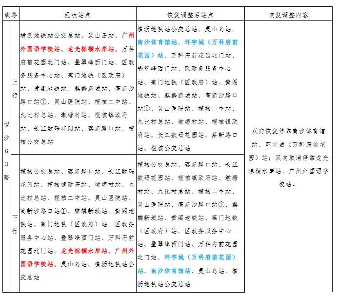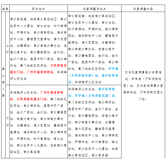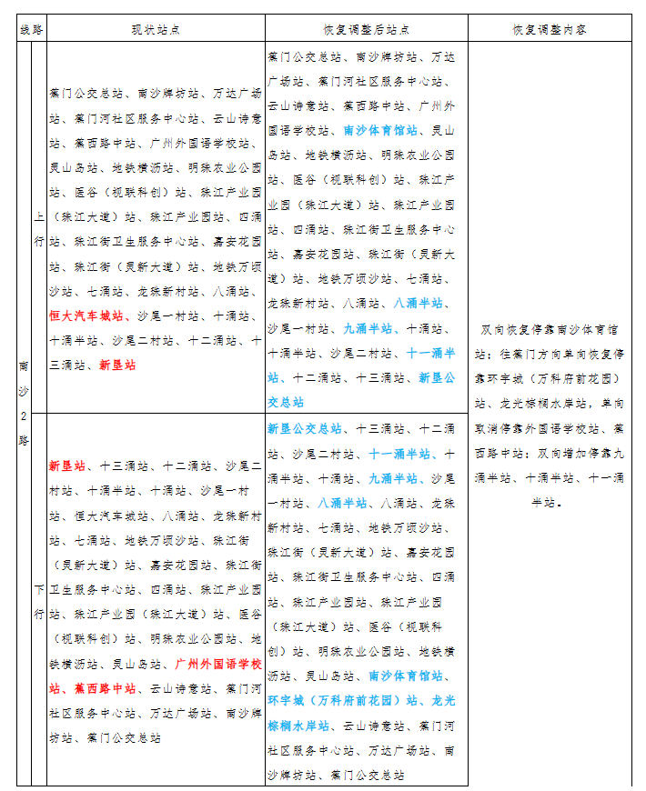 双向恢复停靠南沙体育馆站、环宇城(万科府前花园)站、龙光棕榈水岸站,双向取消停靠广州外国语学校站、蕉西路中站;