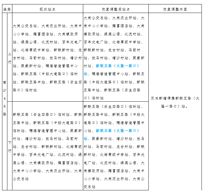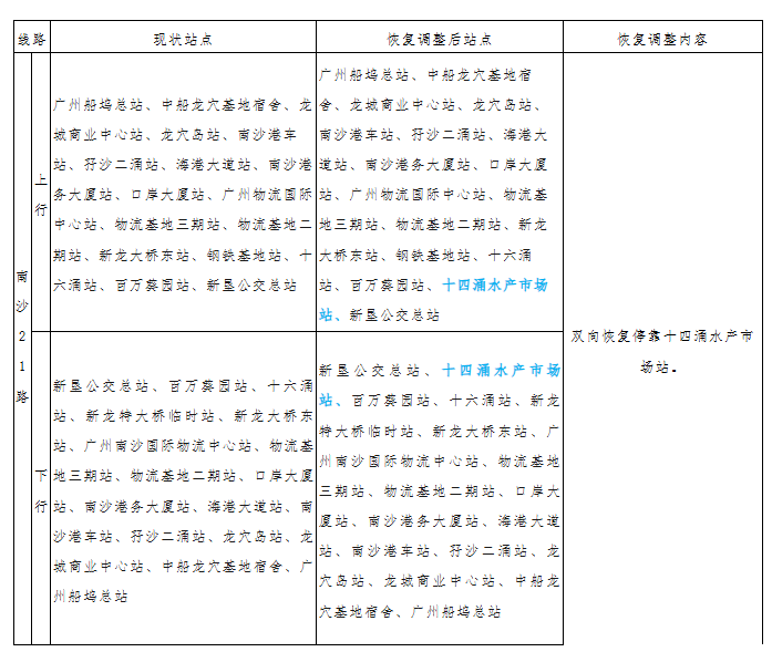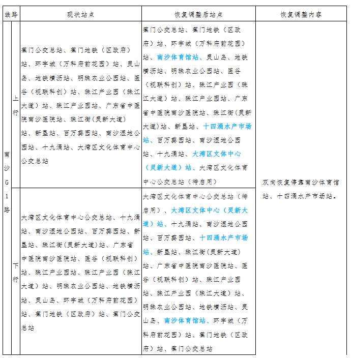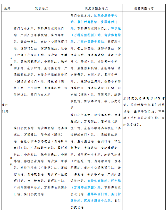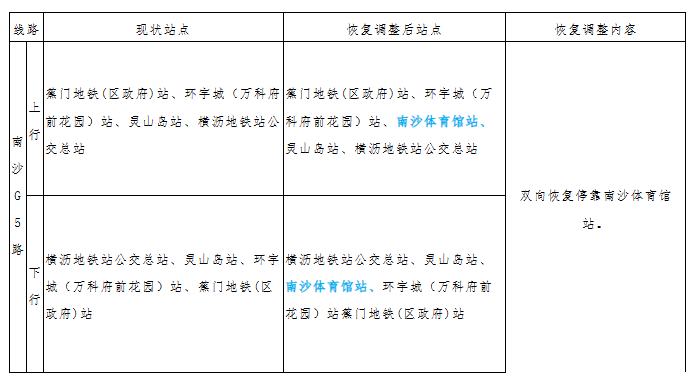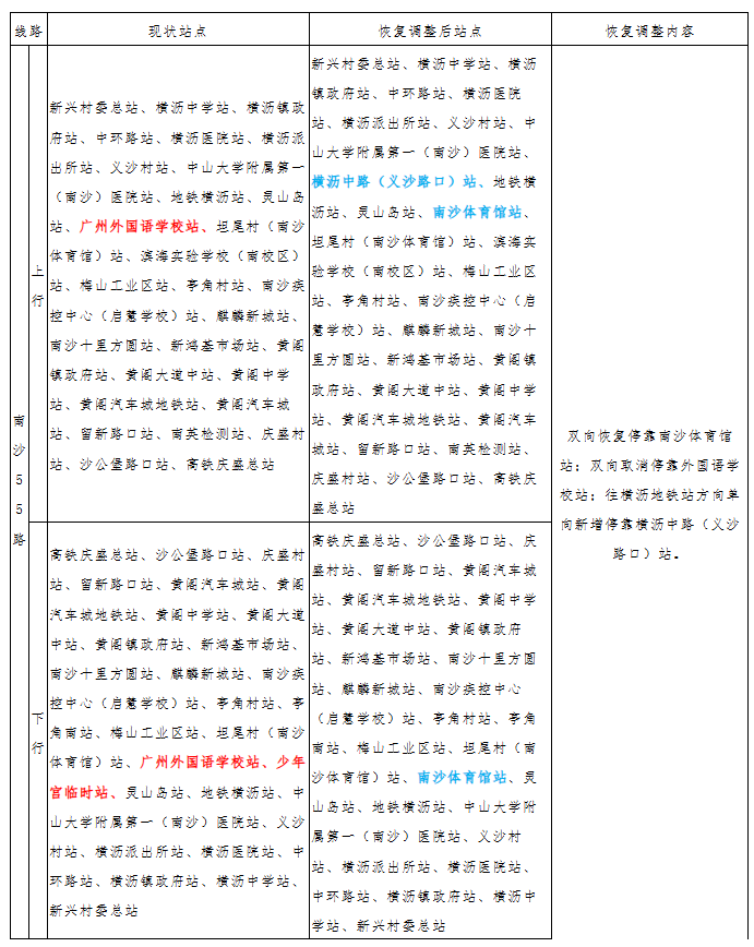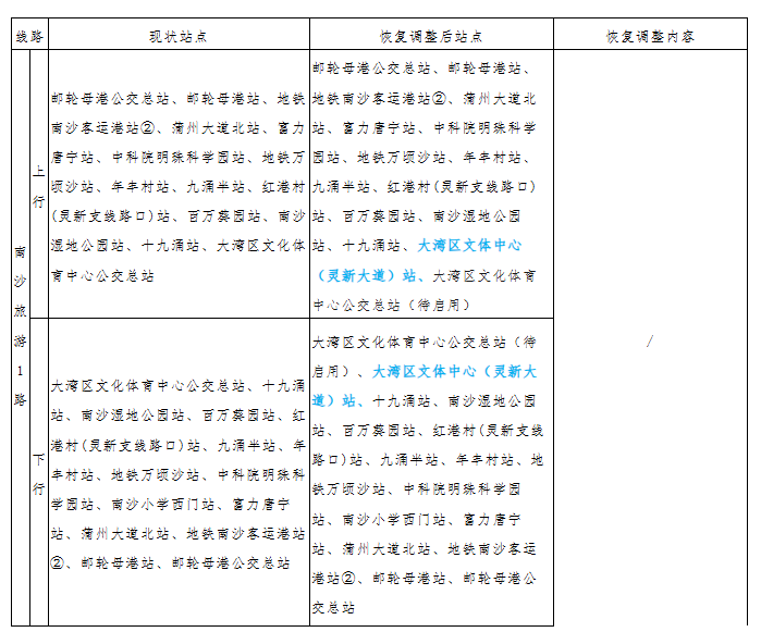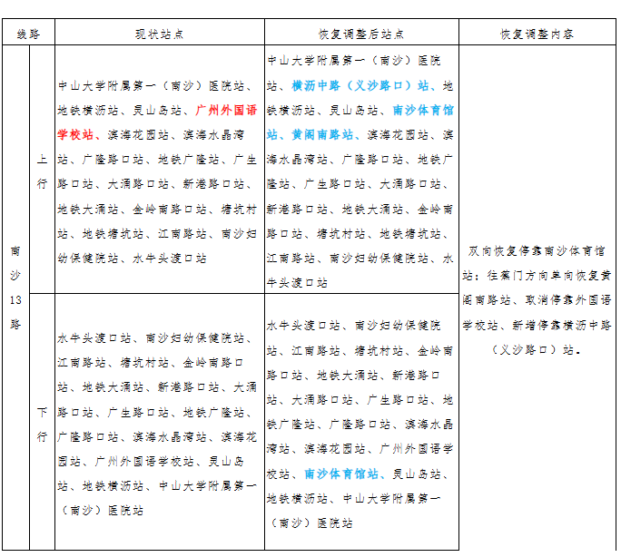 双向恢复停靠南沙体育馆站、环宇城(万科府前花园)站、龙光棕榈水岸站,双向取消停靠广州外国语学校站、蕉西路中站;
