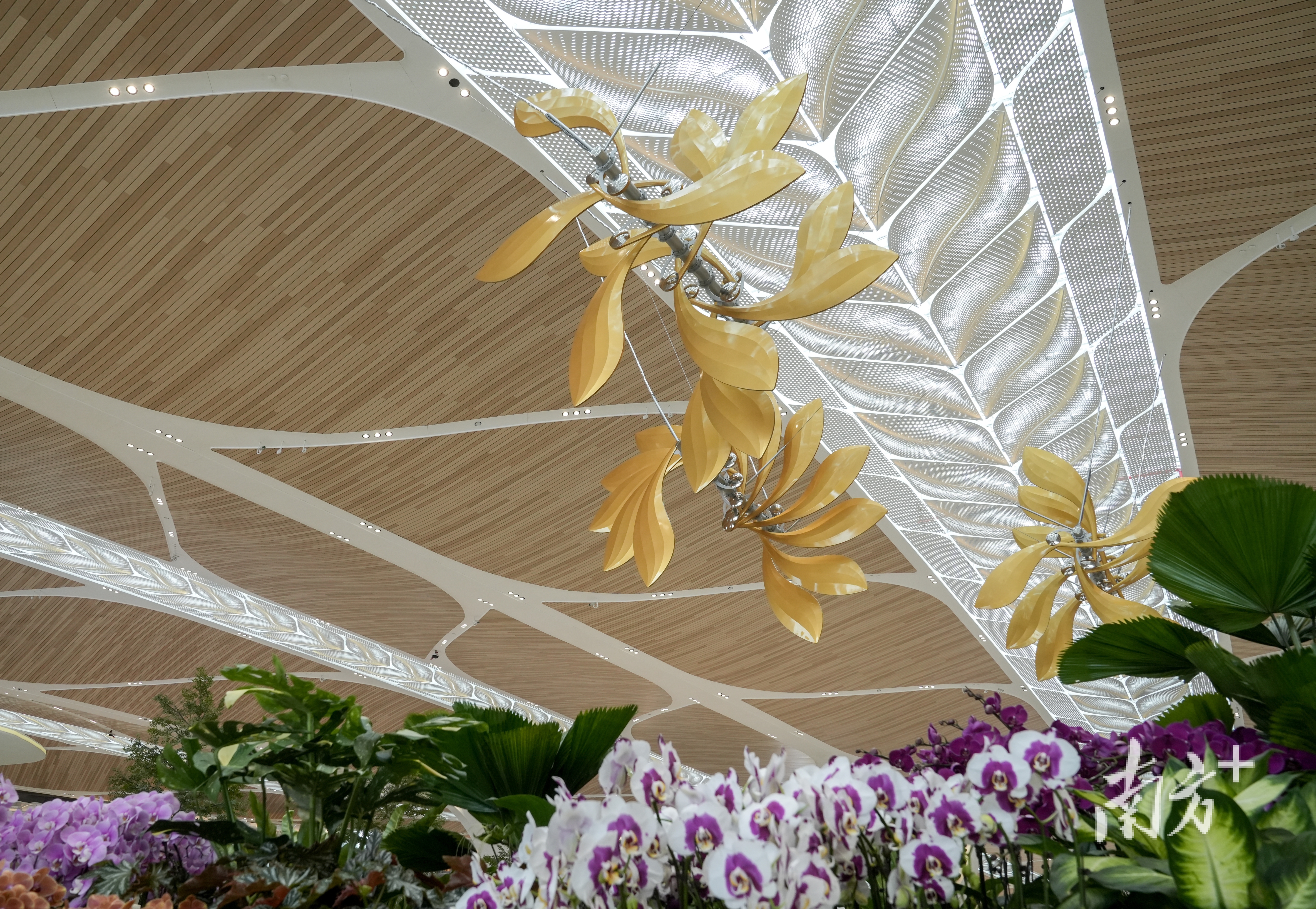 从花形雨篷步入T3航站楼,“花开穗满”画卷即刻铺展,“稻穗”形天窗滤过柔和阳光洒在全国首创的“花瓣”值机岛上,木纹吊顶、木质底色标识牌与绿植相映。白云机场T3航站楼将“千年商都”形象藏进细节,融入每一处体验。