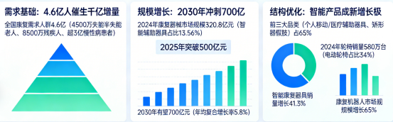 康复辅助器具是指通过代偿、补偿或替代的方式,帮助功能障碍者(包括老年人、残疾人、术后患者等)改善身体功能、提高生活质量的产品总称。我国康复辅具市场正处于“需求爆发+供给升级”的双重驱动期。数据显示,全国具有康复需求的人群已达4.6亿,包括4500万失能半失能老人、8500万残疾人及超3亿慢性病患者,构成坚实的“需求金字塔”。