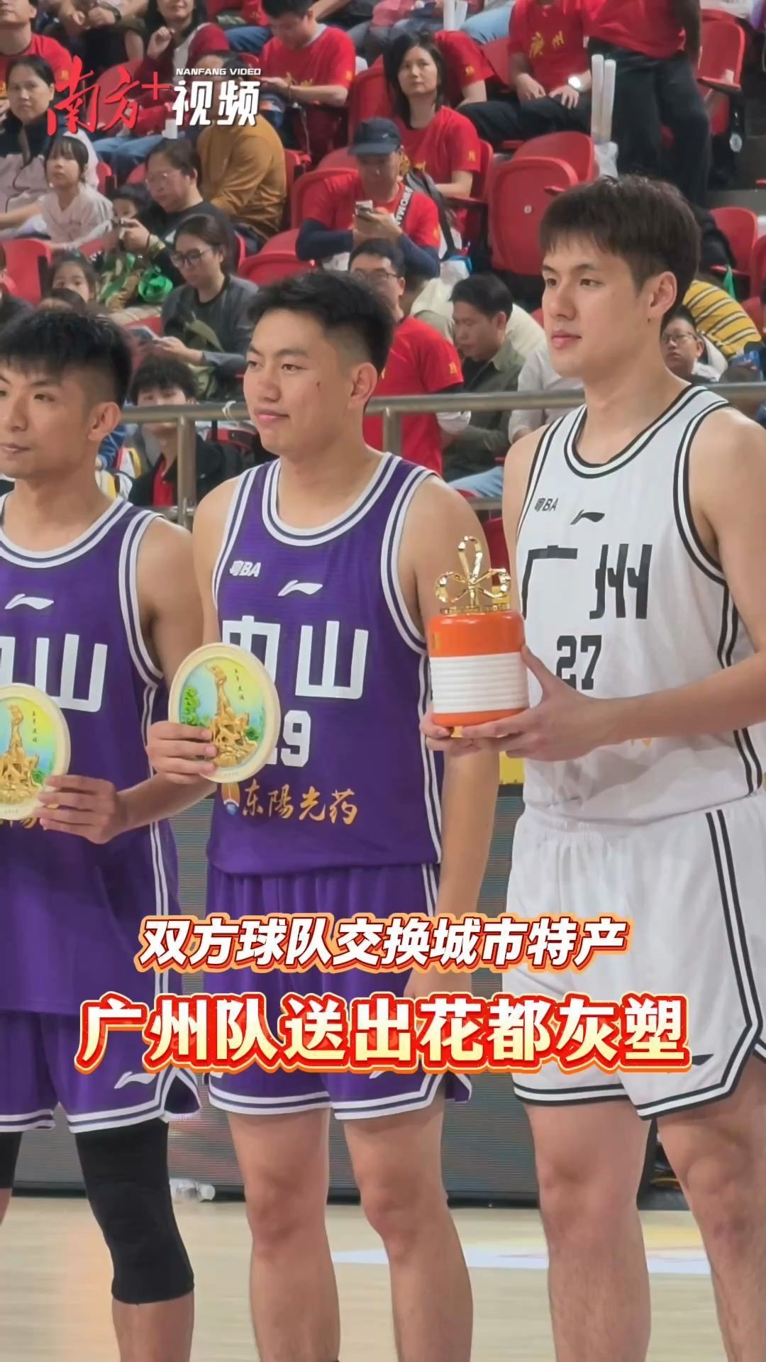 视频|粤BA揭幕战广州中山交换城市特产,广州队送出五羊图案灰塑