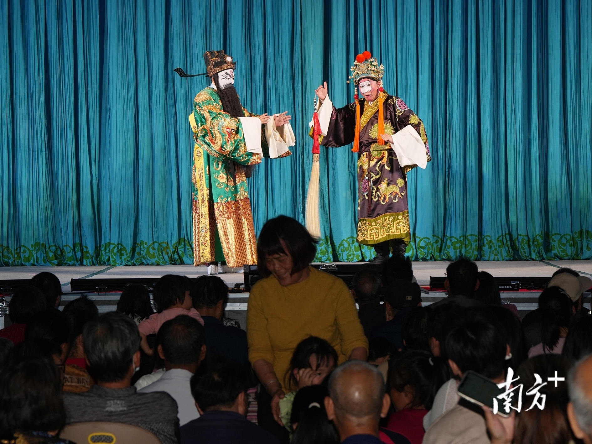 湛江吴川振文镇鱼笱埠,粤剧《唐明皇与杨贵妃》演出现场,图右为广州粤剧院资深演员陆敏渭扮演的高力士。