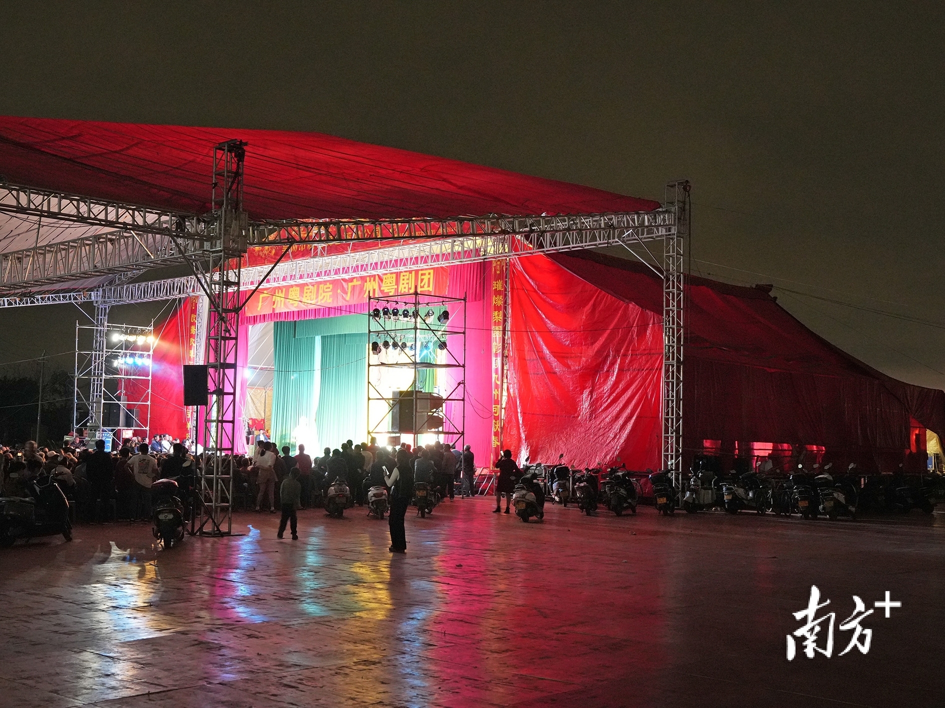 湛江吴川振文镇鱼笱埠,为了迎接春班演出,村里在田野间临时搭建起一个大型舞台。