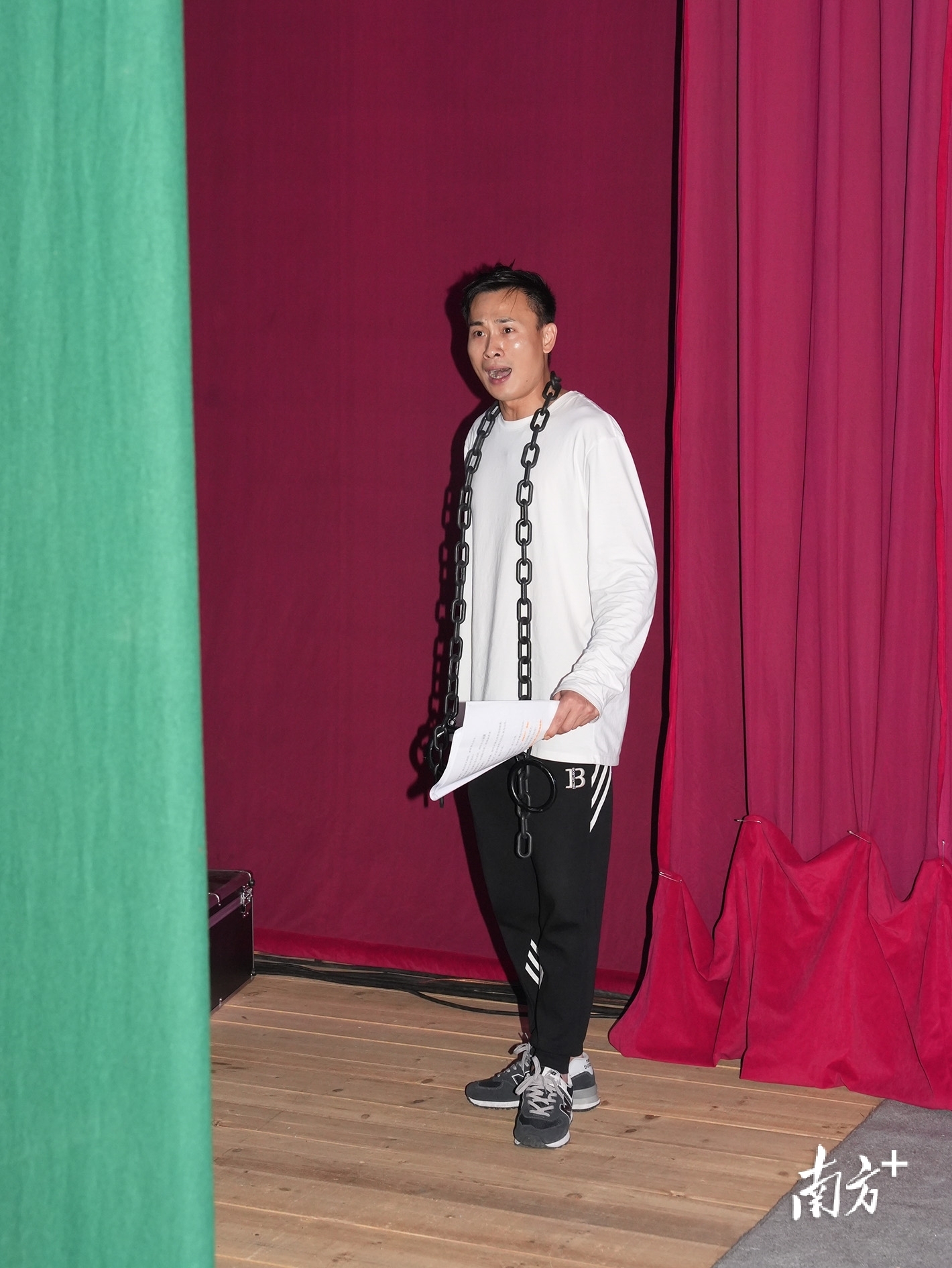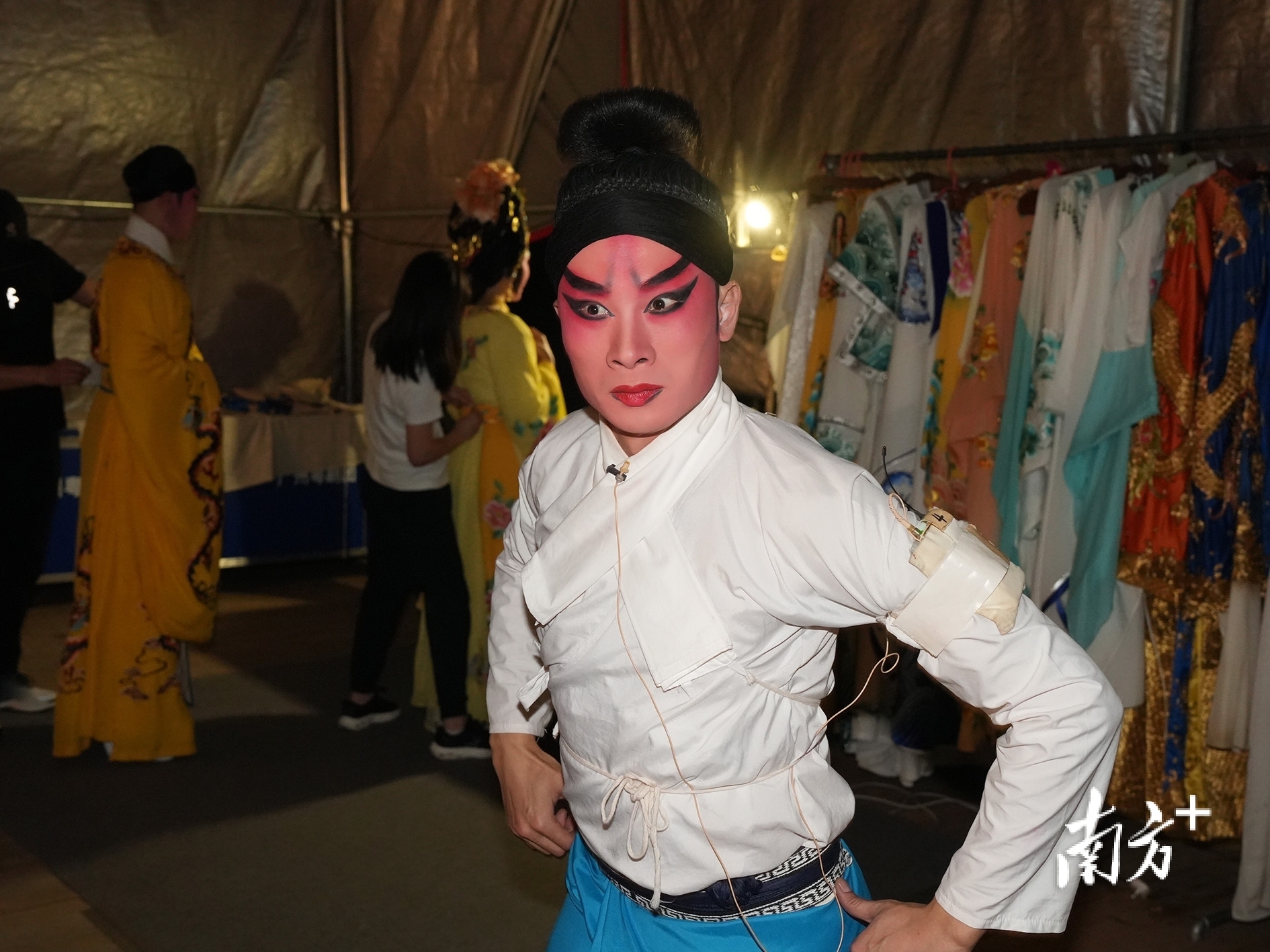 湛江吴川振文镇鱼笱埠,排队更换戏服的间歇,粤剧《唐明皇与杨贵妃》中扮演安禄山的广州粤剧院青年演员刘华景练习戏中动作。