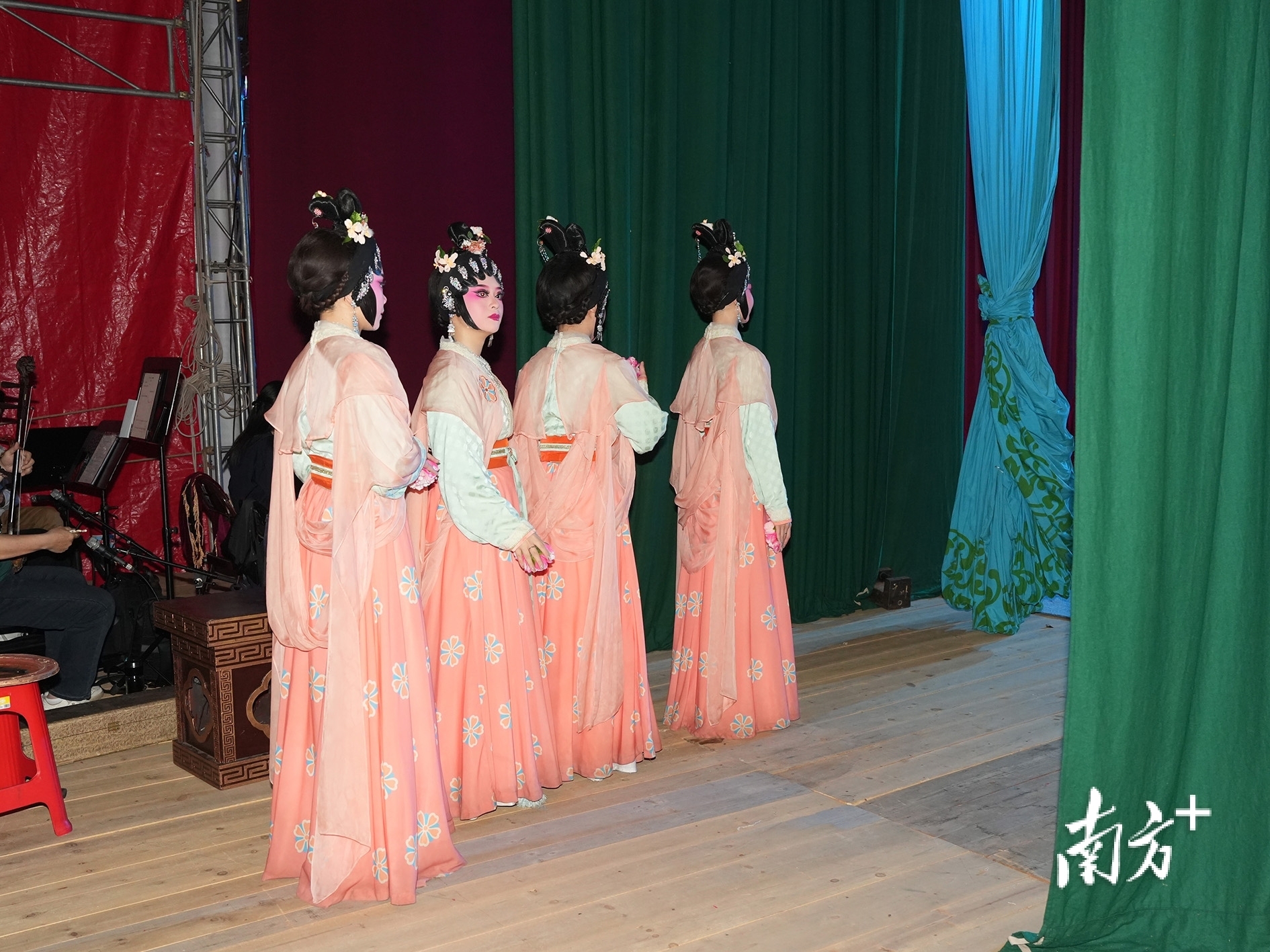 湛江吴川振文镇鱼笱埠,粤剧《唐明皇与杨贵妃》开演前,准备登台的年轻演员们。