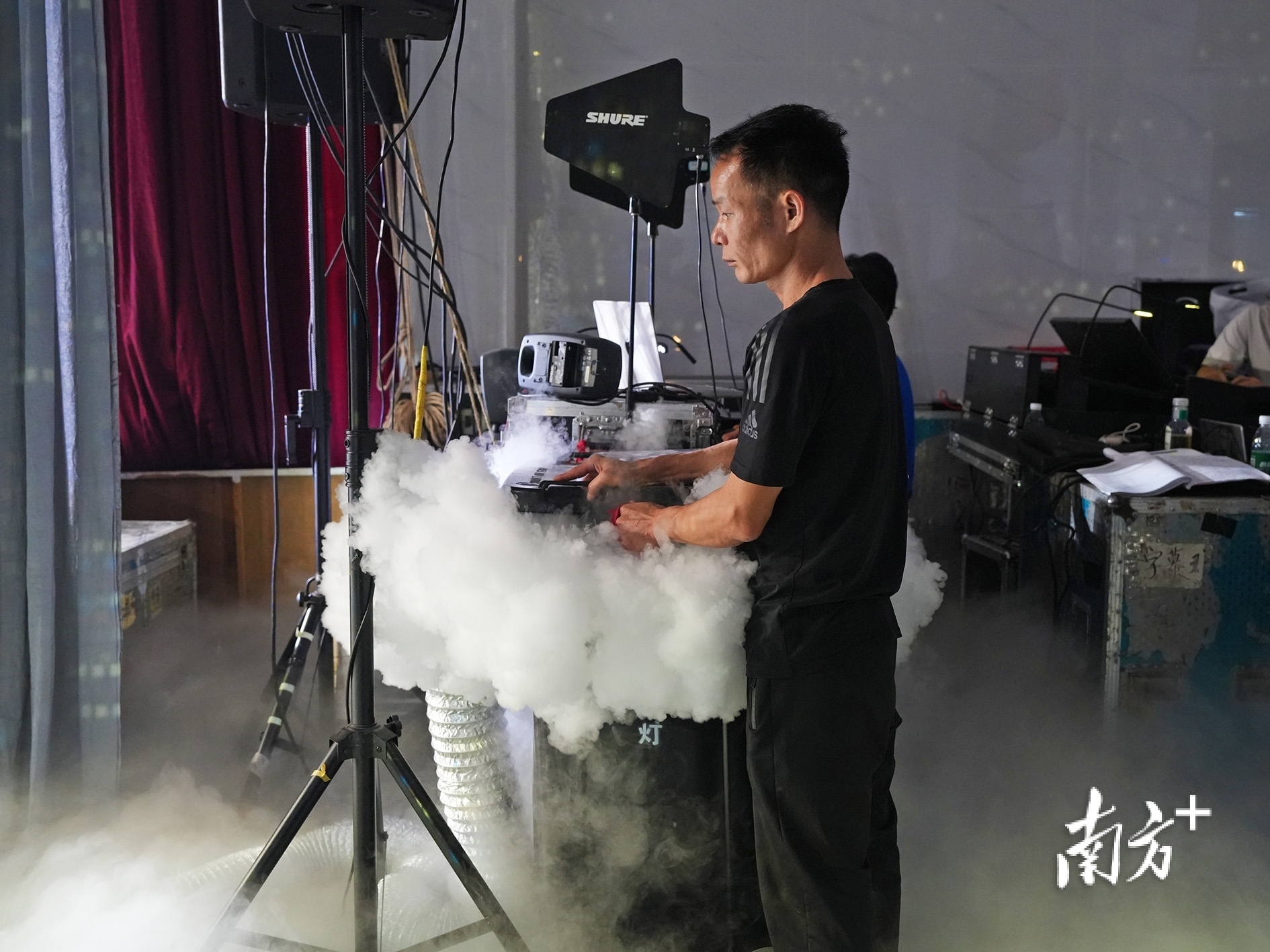 湛江吴川塘㙍镇塘下村,粤剧《鹊桥会》的演出侧台,来自广东粤剧院的工作人员正在释放干冰。