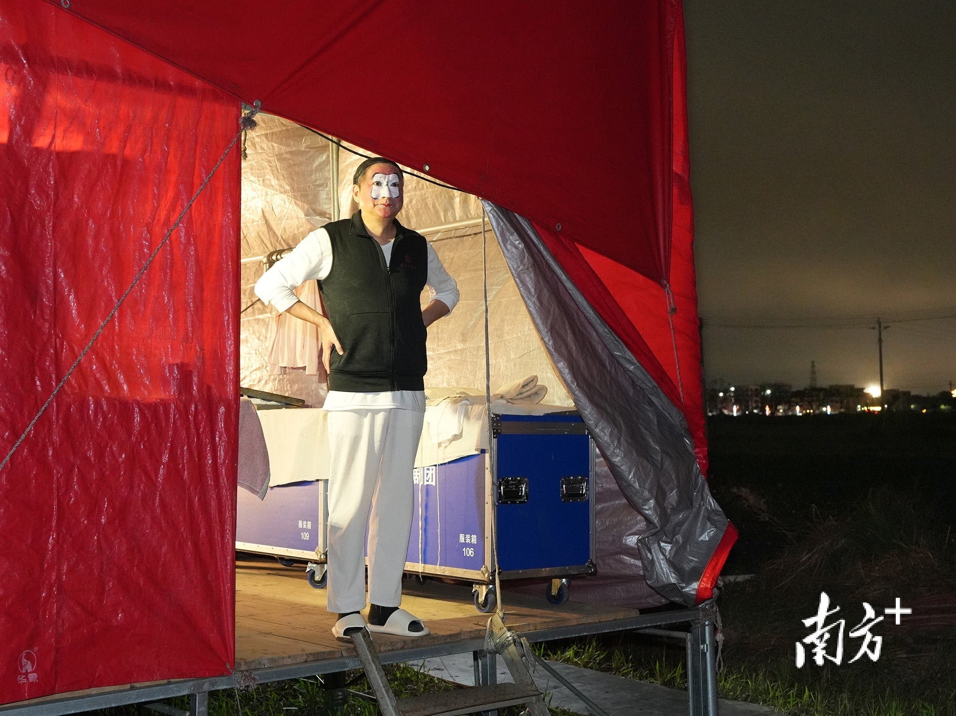 湛江吴川振文镇鱼笱埠,临时搭建的演出大棚后台入口处,在粤剧《唐明皇与杨贵妃》中饰演高力士的广州粤剧院演员陆敏渭观看邻近村镇燃放的烟花。