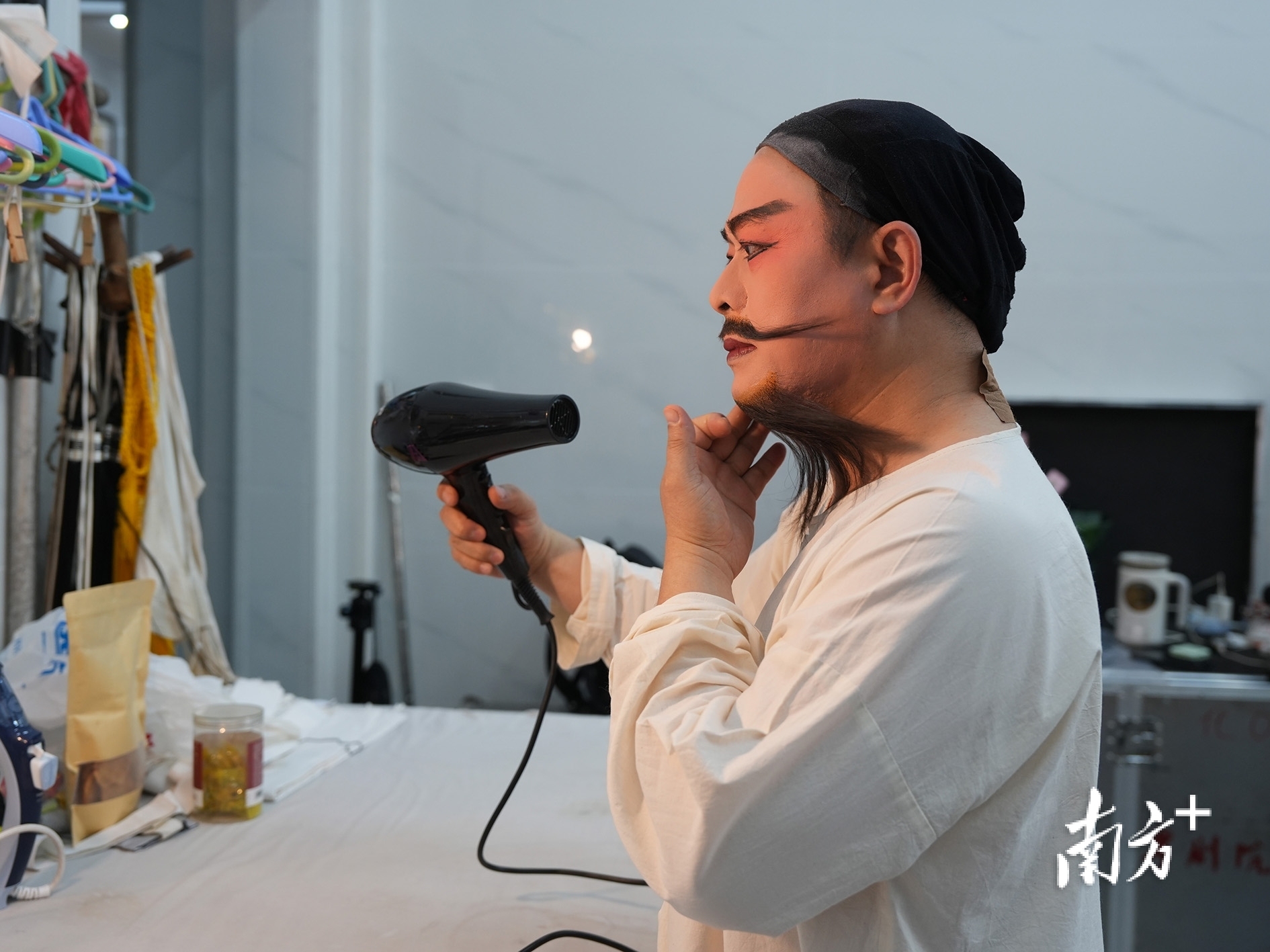 湛江吴川塘㙍镇塘下村,粤剧《鹊桥会》的演出后台,来自广东粤剧院的粤剧演员用吹风筒加热粘贴的胡子,以便粘胶更牢固。