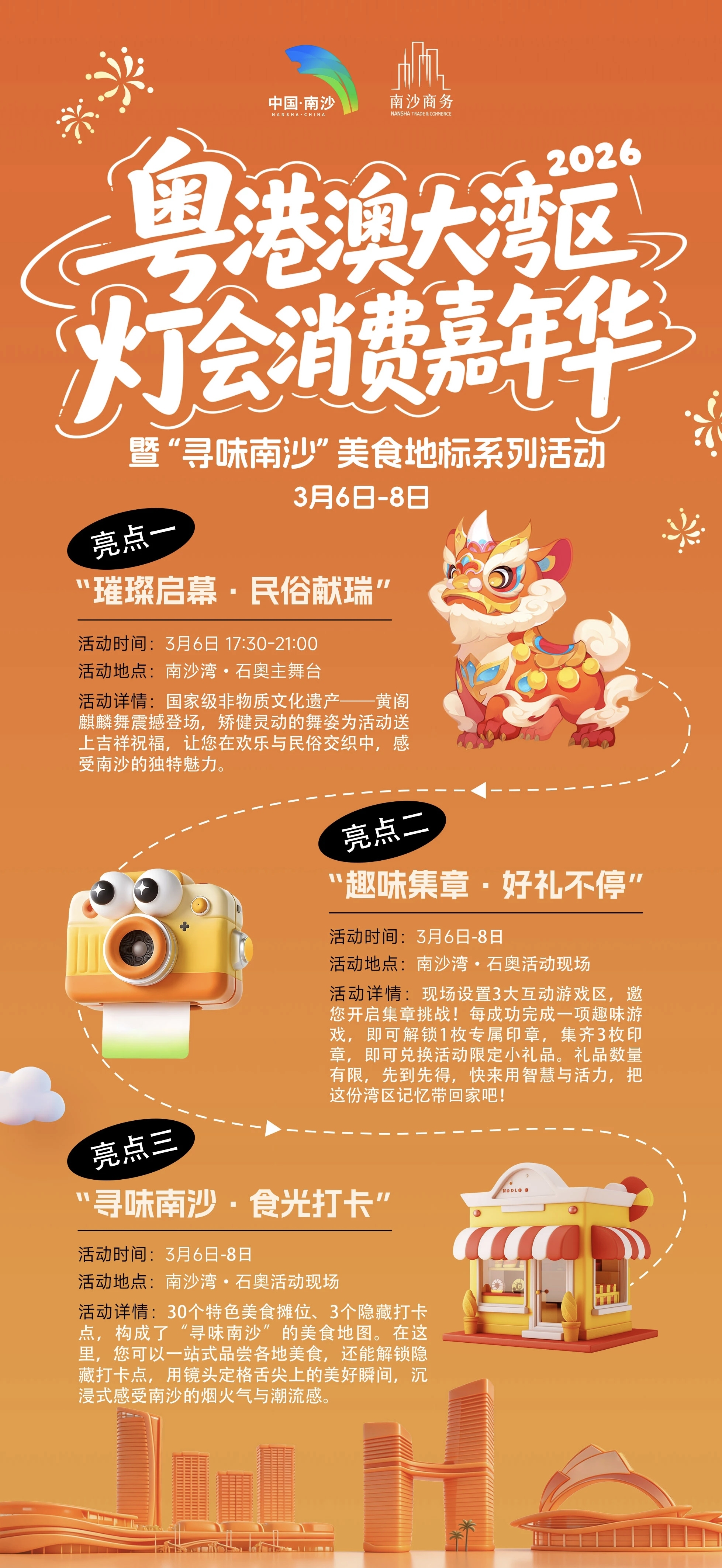 2026年粤港澳大湾区灯会消费嘉年华暨“寻味南沙”美食地标系列活动将于3月6日—8日在南沙湾·石奥举办。这也是南沙区2026年首场消费盛宴,市民游客可在此一站式体验赏地标、看民俗、玩游戏、吃美食、拍大片的乐趣。南方+记者 李心迪通讯员 南沙商务宣 南方日报、南方+客户端原创,未经授权不得转载 编辑 叶颖诗校对 杨远云 订阅后可查看全文(剩余80%)