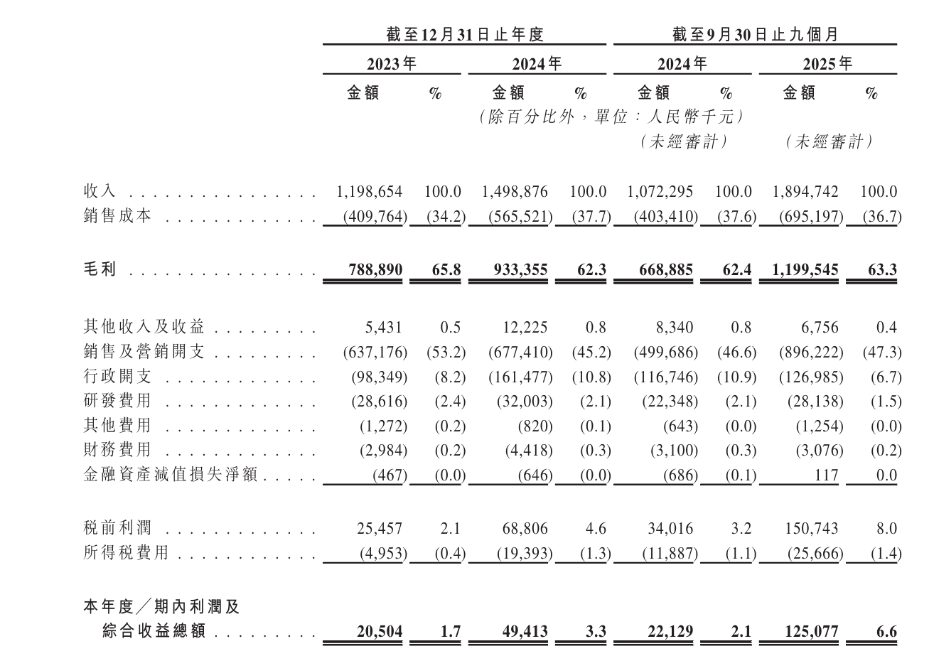 根据招股书披露的数据,2023-2024年,半亩花田营业收入从11.99亿元增至14.99亿元;2025年前三季度收入达18.95亿元,较2024年同期增长76.7%。同期,公司经调整净利润从2023年的2370万元猛增至2024年的8280万元,增幅达249.4%。2025年前九个月的净利润达到1.48亿元,同比增长197.2%。
