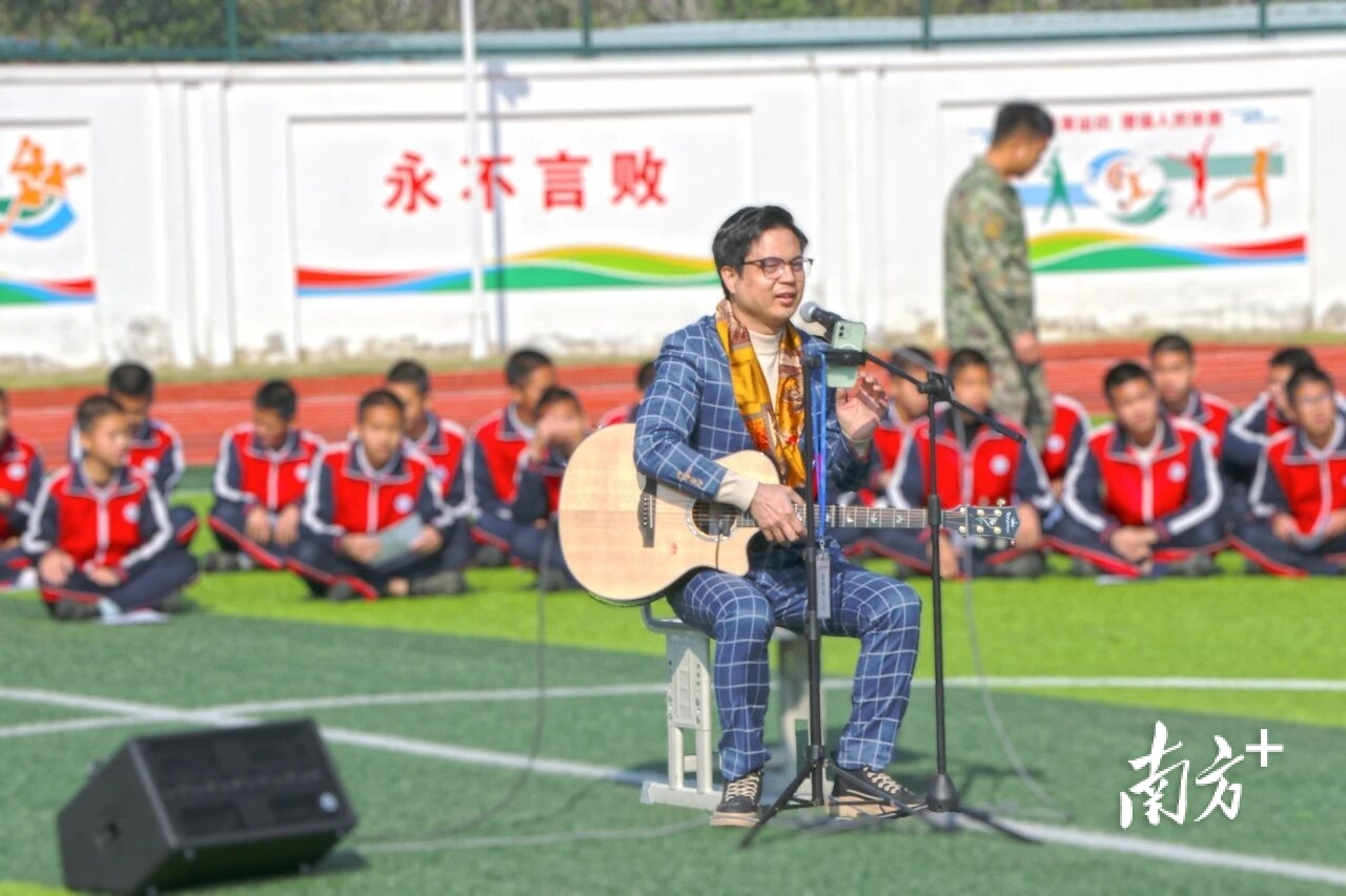 赠书仪式后,校园操场变成了温馨的露天舞台。活动特邀阳江音乐家协会理事、阳西县音乐家协会常务副主席陈永誉,与师生共度温馨音乐时光。在陈老师的带领下,《无名的人》《父亲》《海阔天空》等经典旋律接连唱响,引发全场共鸣。歌声悠扬,掌声与欢笑交织,音乐不仅拉近了彼此距离,更让学生在艺术熏陶中感受到社会的温暖接纳与情感陪伴。