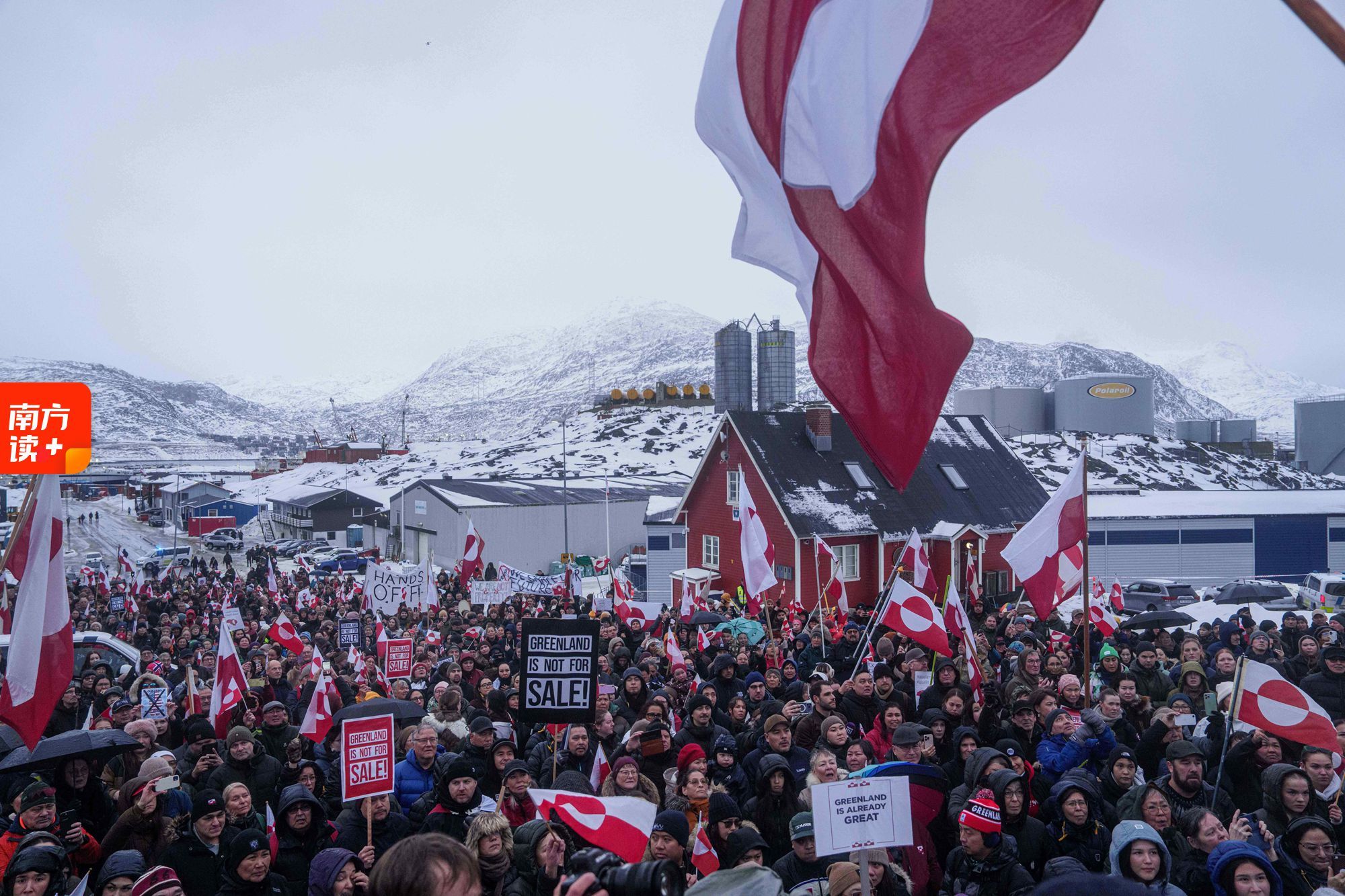 1月17日,在丹麦自治领地格陵兰岛首府努克的美国领事馆前,人们参加示威游行。图源:新华社