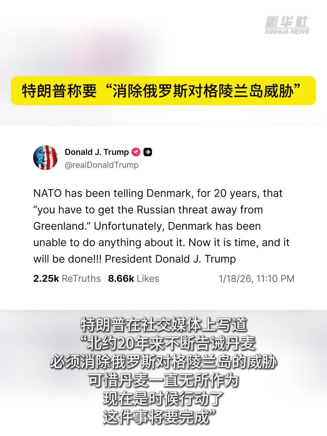 同日,美国总统特朗普再次就格陵兰岛问题发声,声称要“消除俄罗斯对格陵兰岛的威胁,可惜丹麦一直无所作为。现在是时候行动了”。