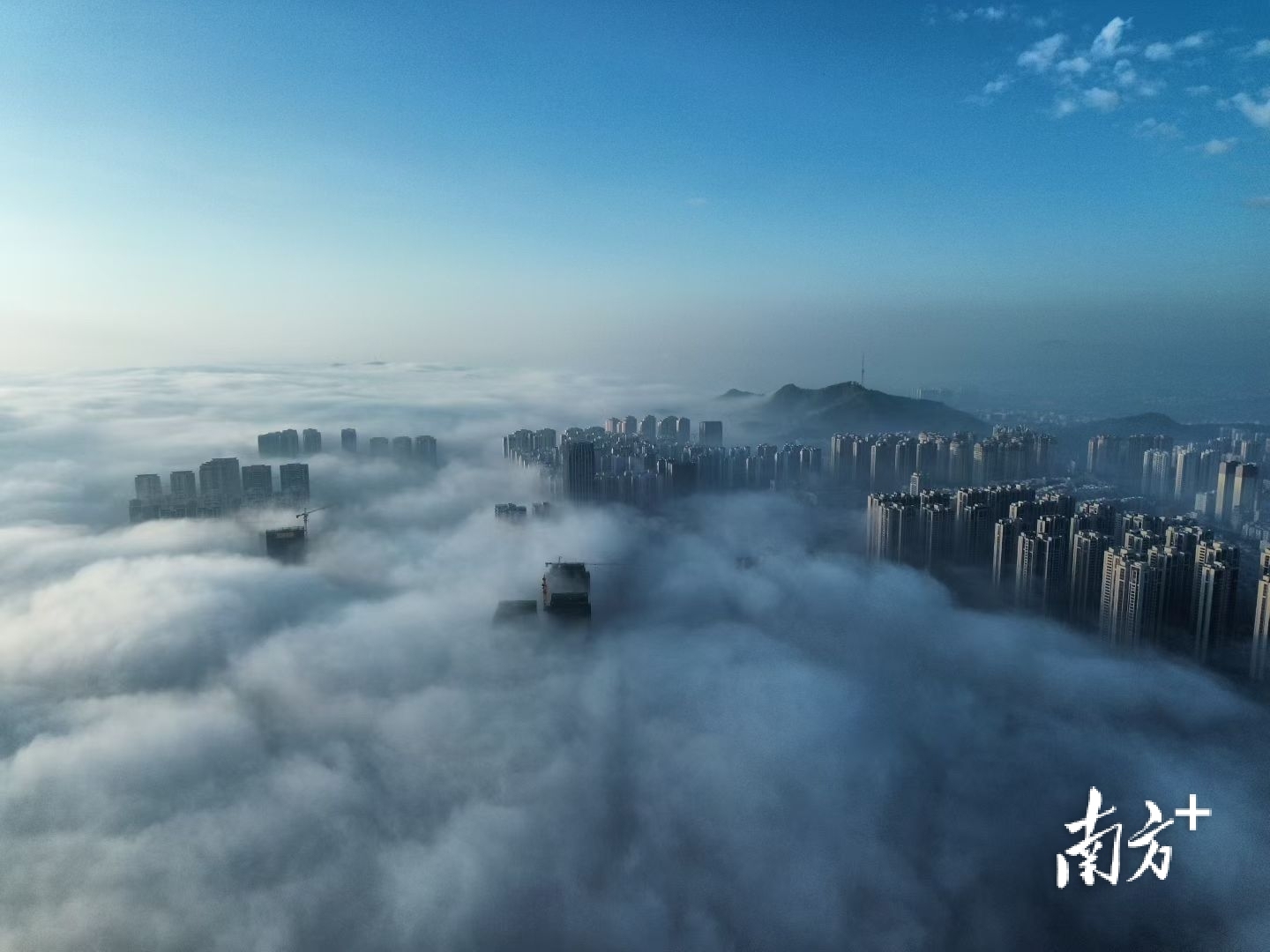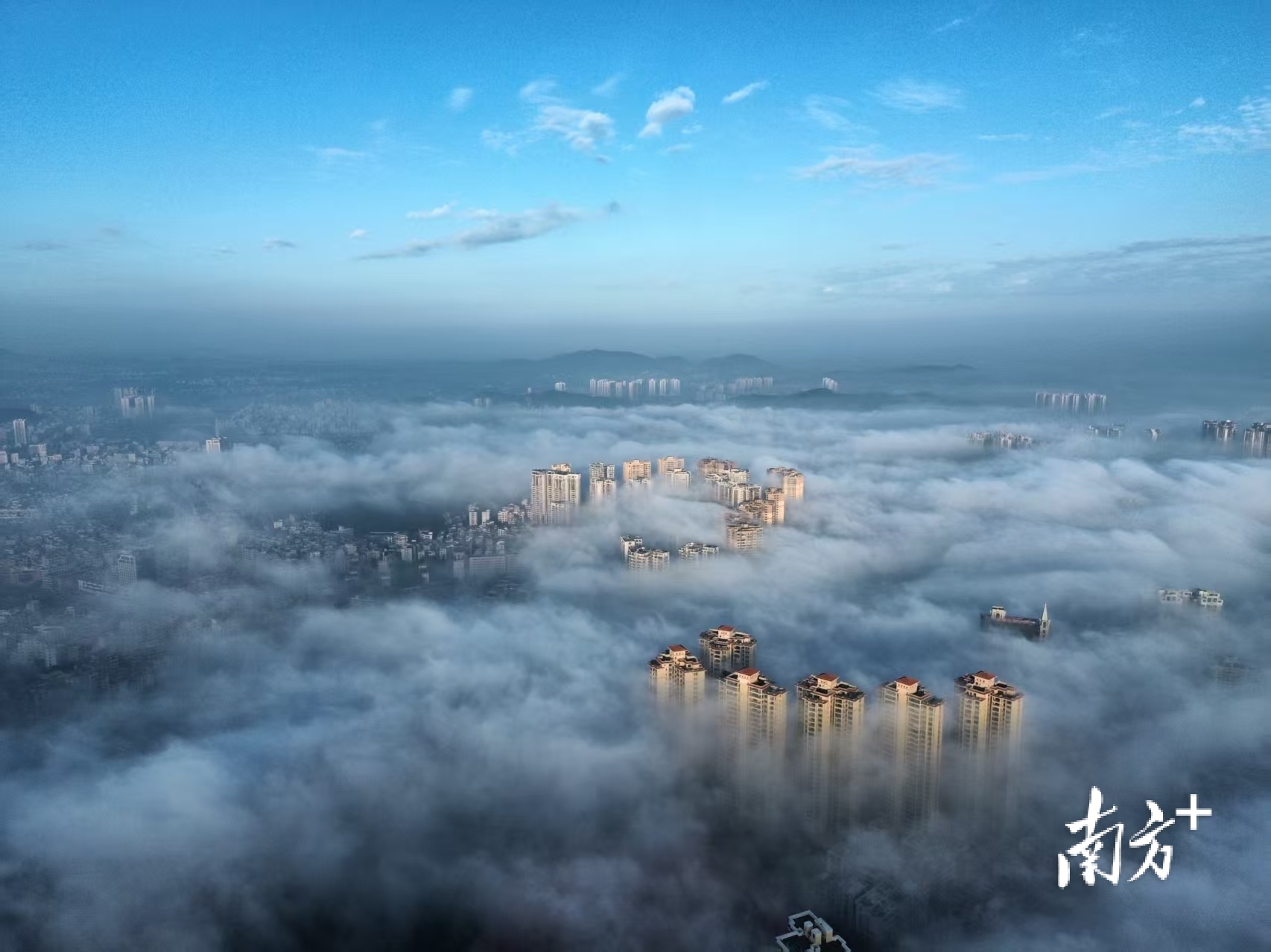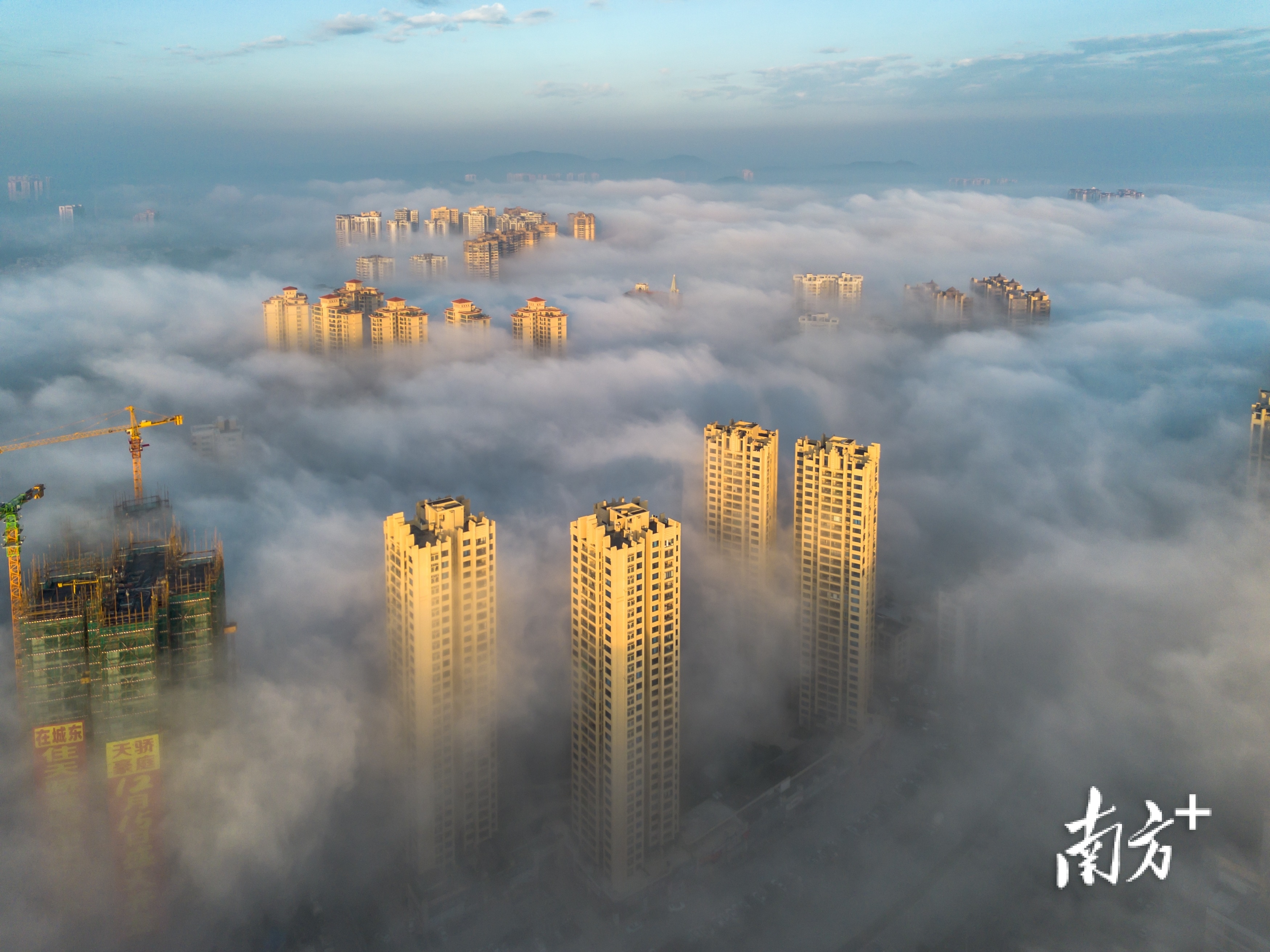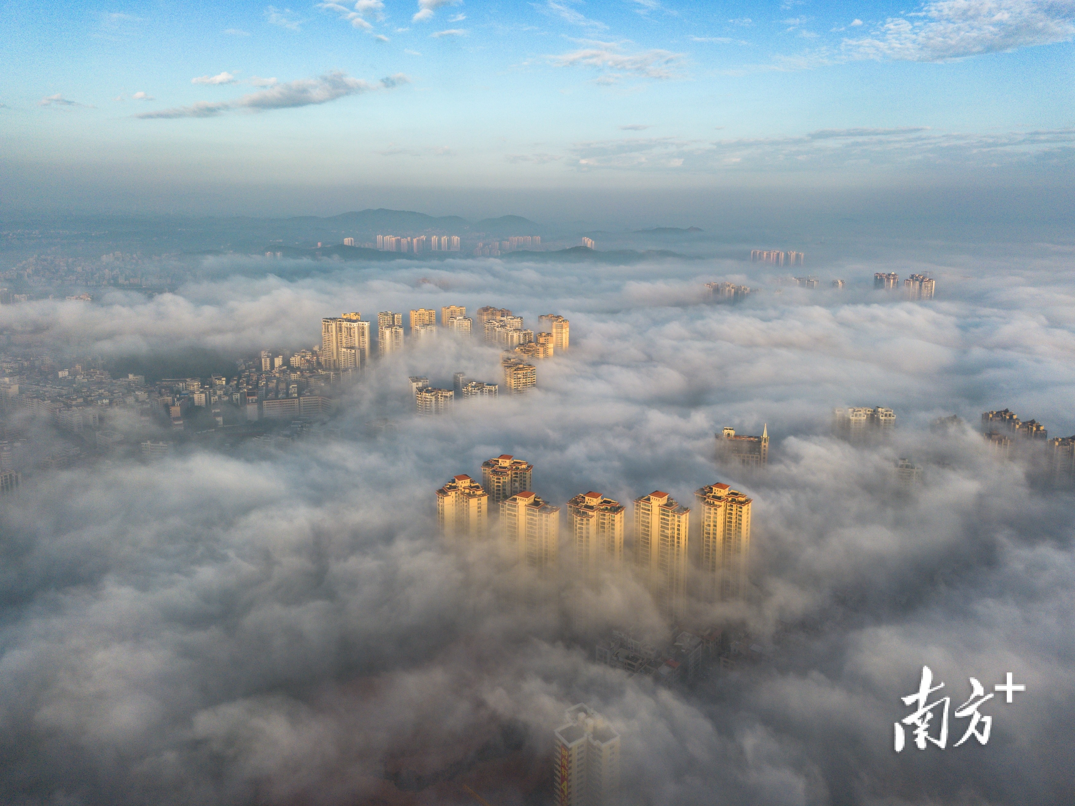在摄影爱好者李荣坚的航拍视角下,洁白云海翻涌于城市之间,低处建筑隐没不见,唯有高楼顶端探出云层,远处山影朦胧如黛。晨光初绽,为云海晕染一抹淡金,诗意盎然。