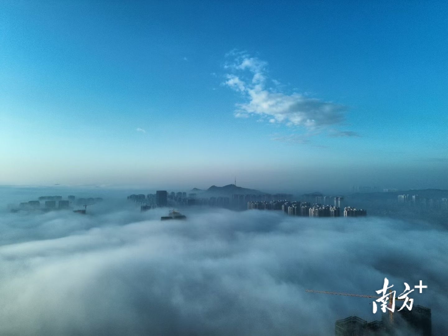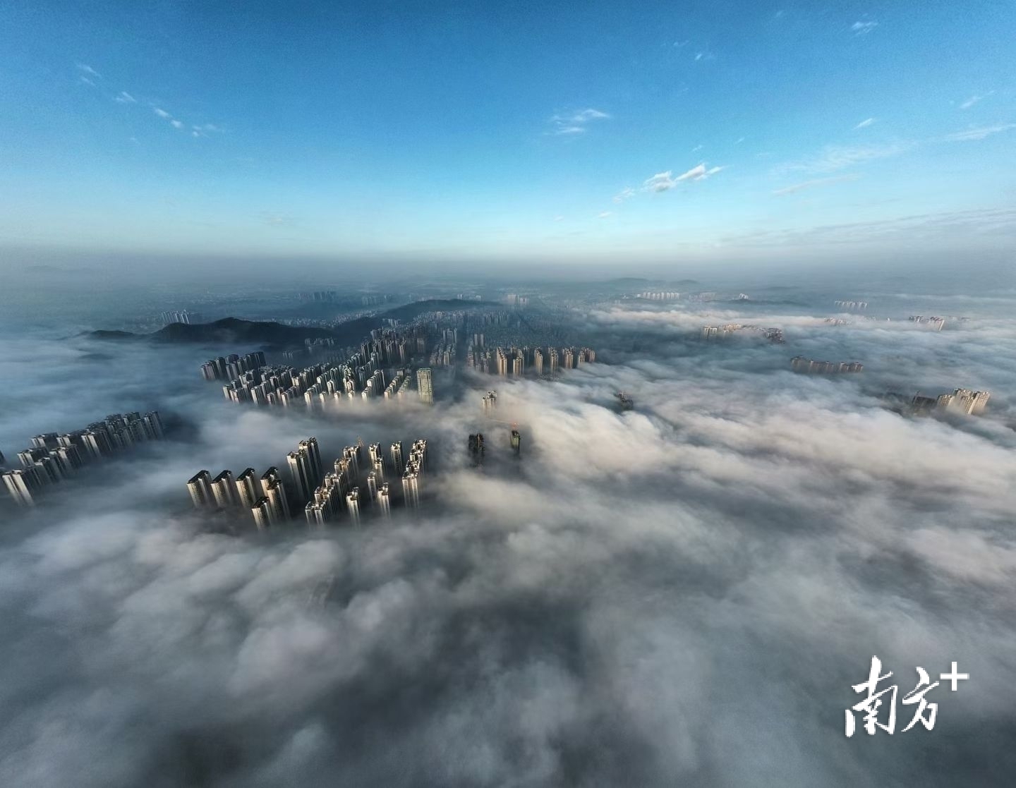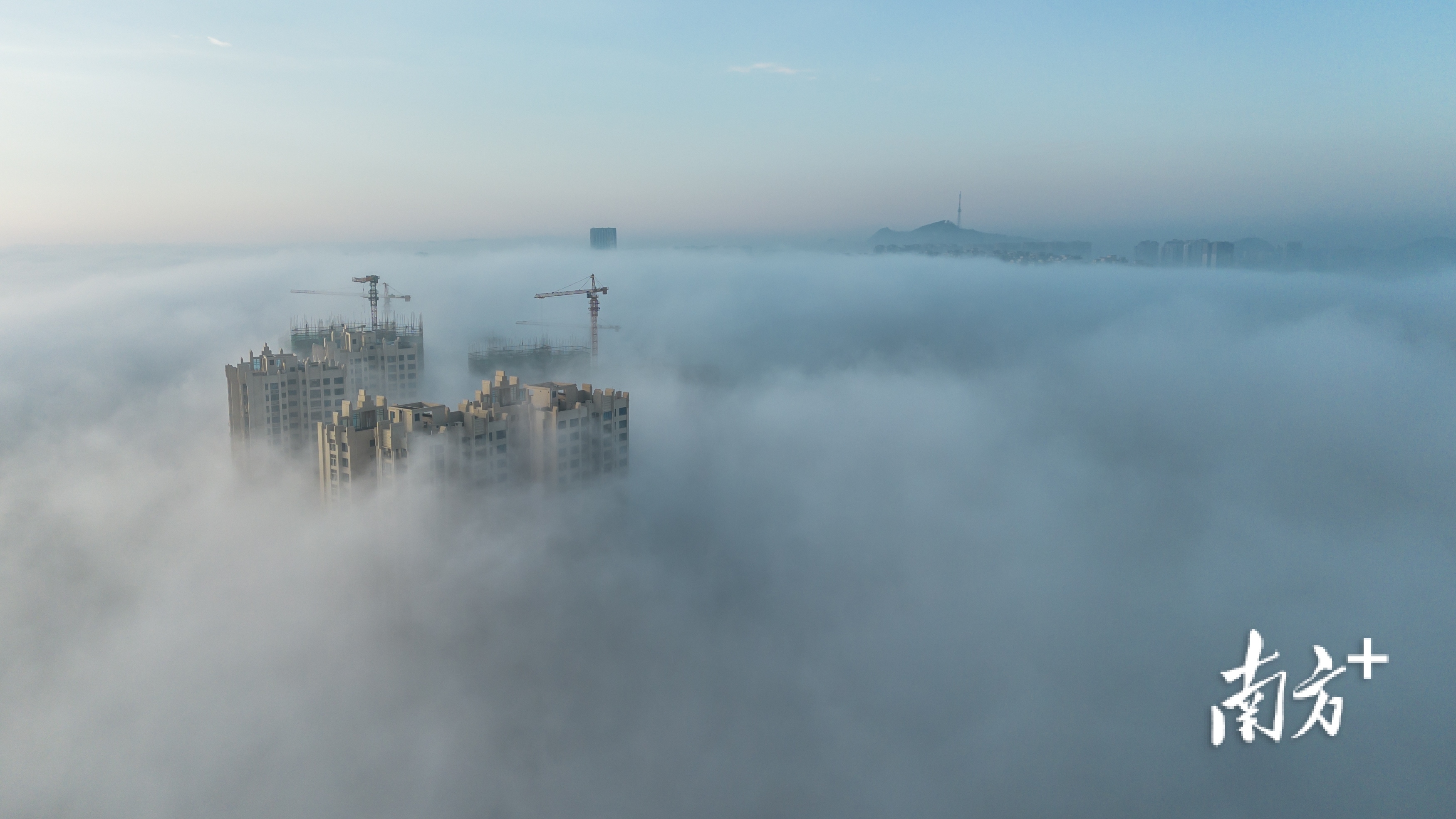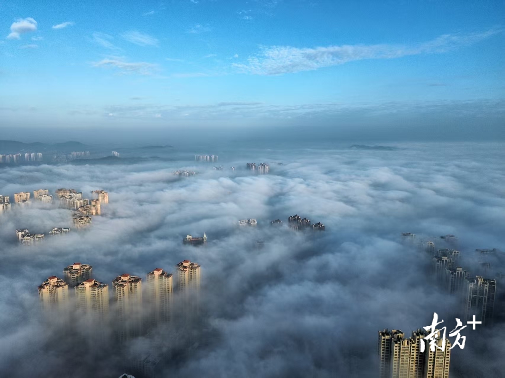 在摄影爱好者李荣坚的航拍视角下,洁白云海翻涌于城市之间,低处建筑隐没不见,唯有高楼顶端探出云层,远处山影朦胧如黛。晨光初绽,为云海晕染一抹淡金,诗意盎然。