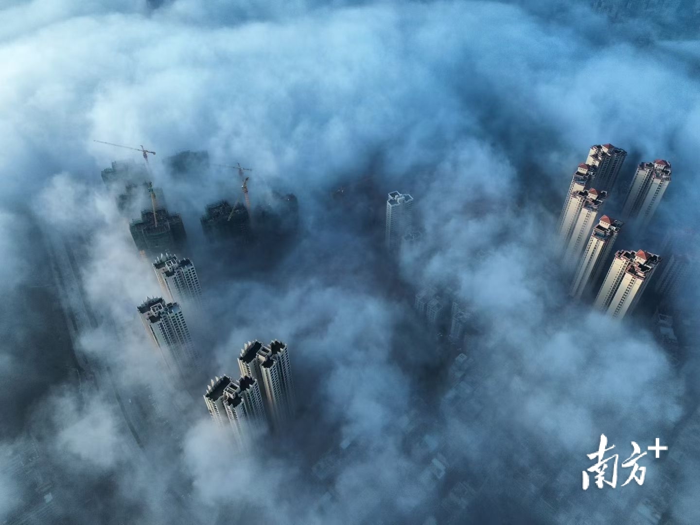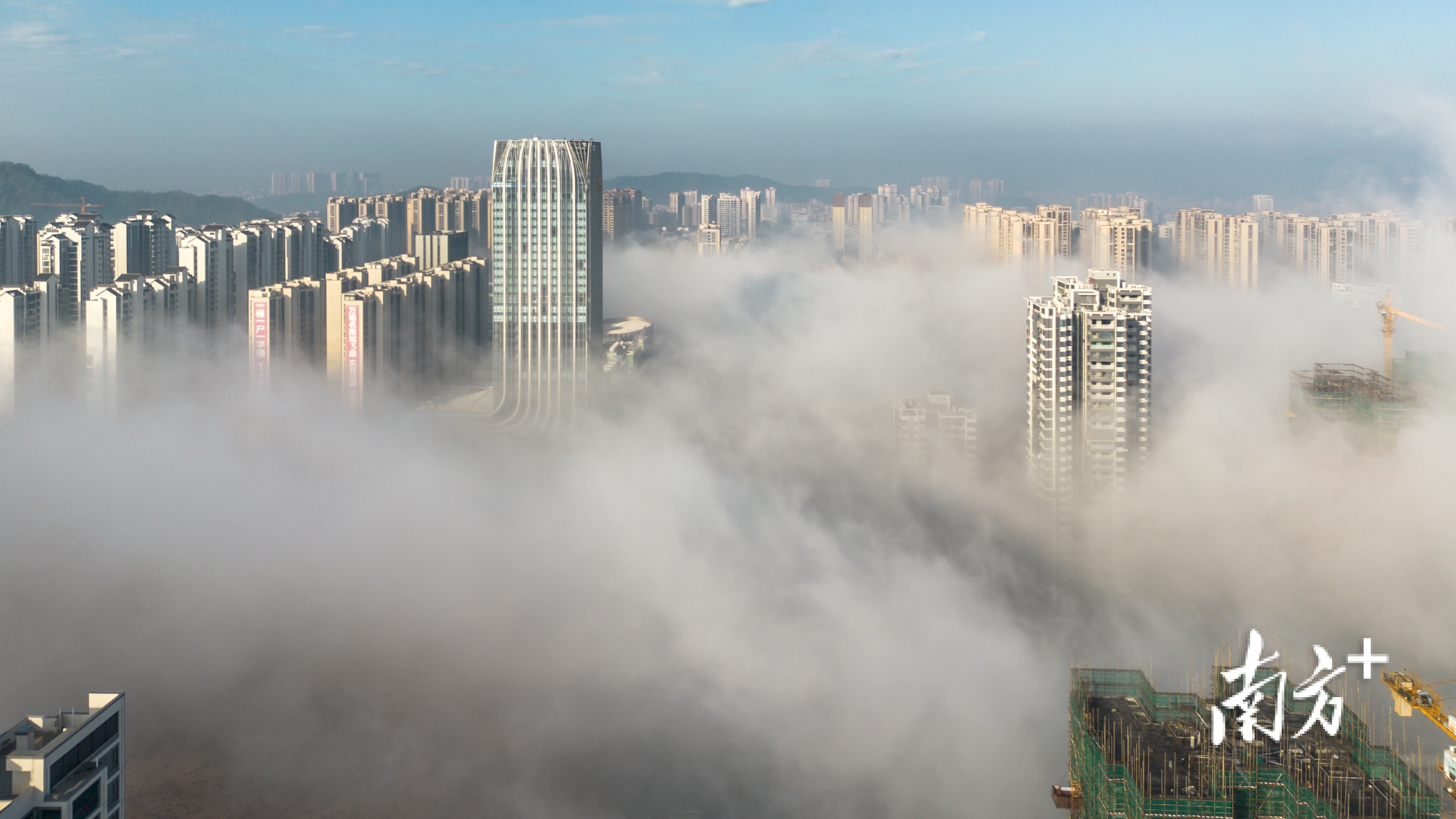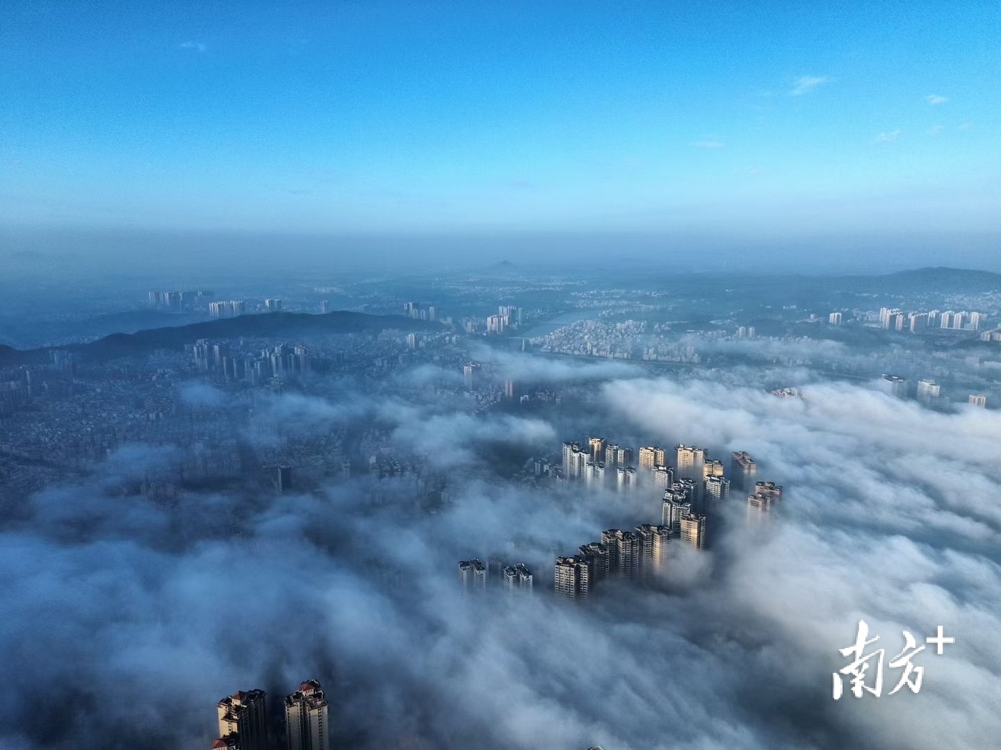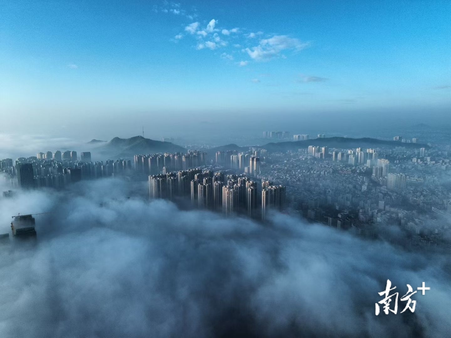 在摄影爱好者李荣坚的航拍视角下,洁白云海翻涌于城市之间,低处建筑隐没不见,唯有高楼顶端探出云层,远处山影朦胧如黛。晨光初绽,为云海晕染一抹淡金,诗意盎然。