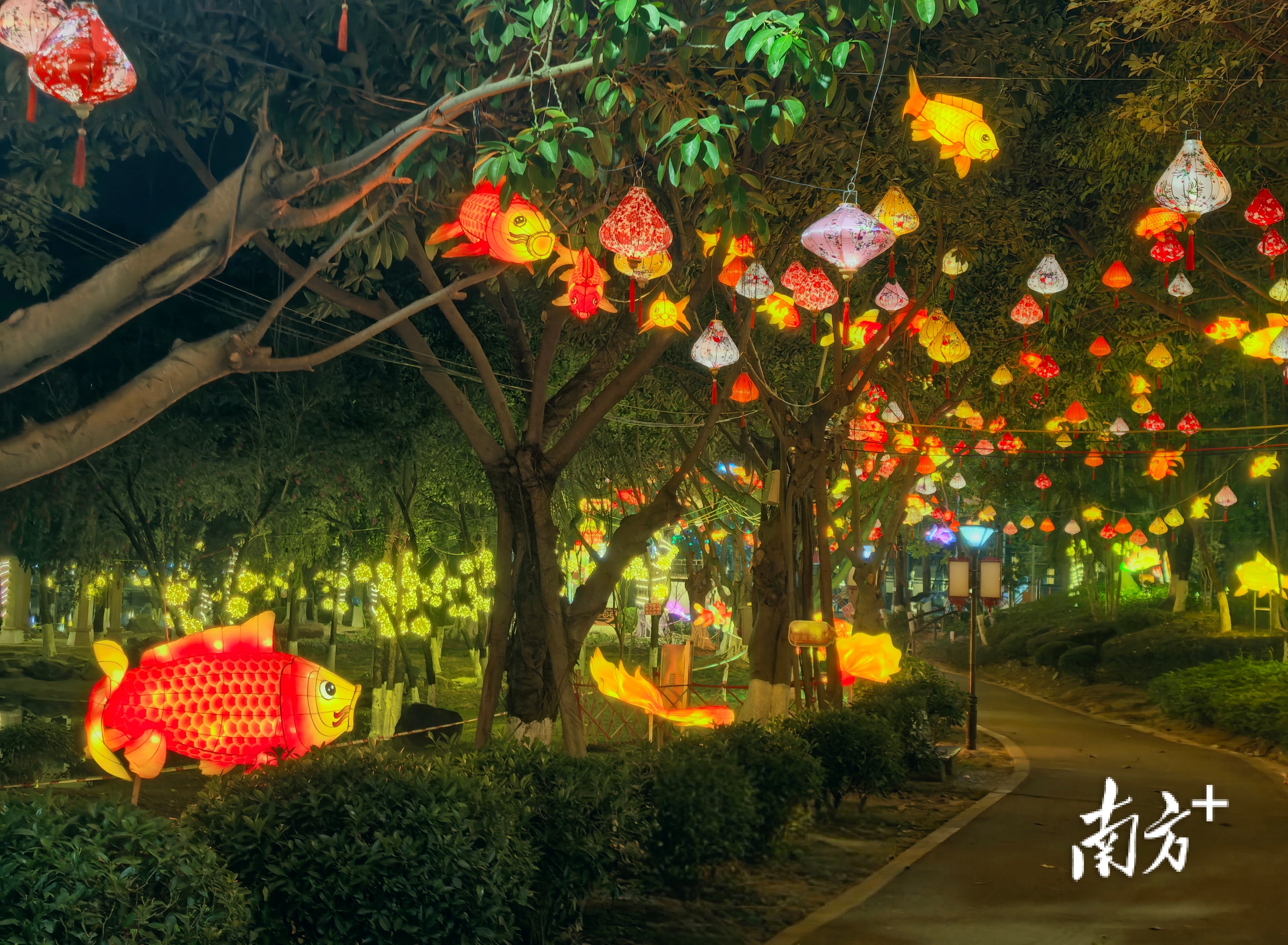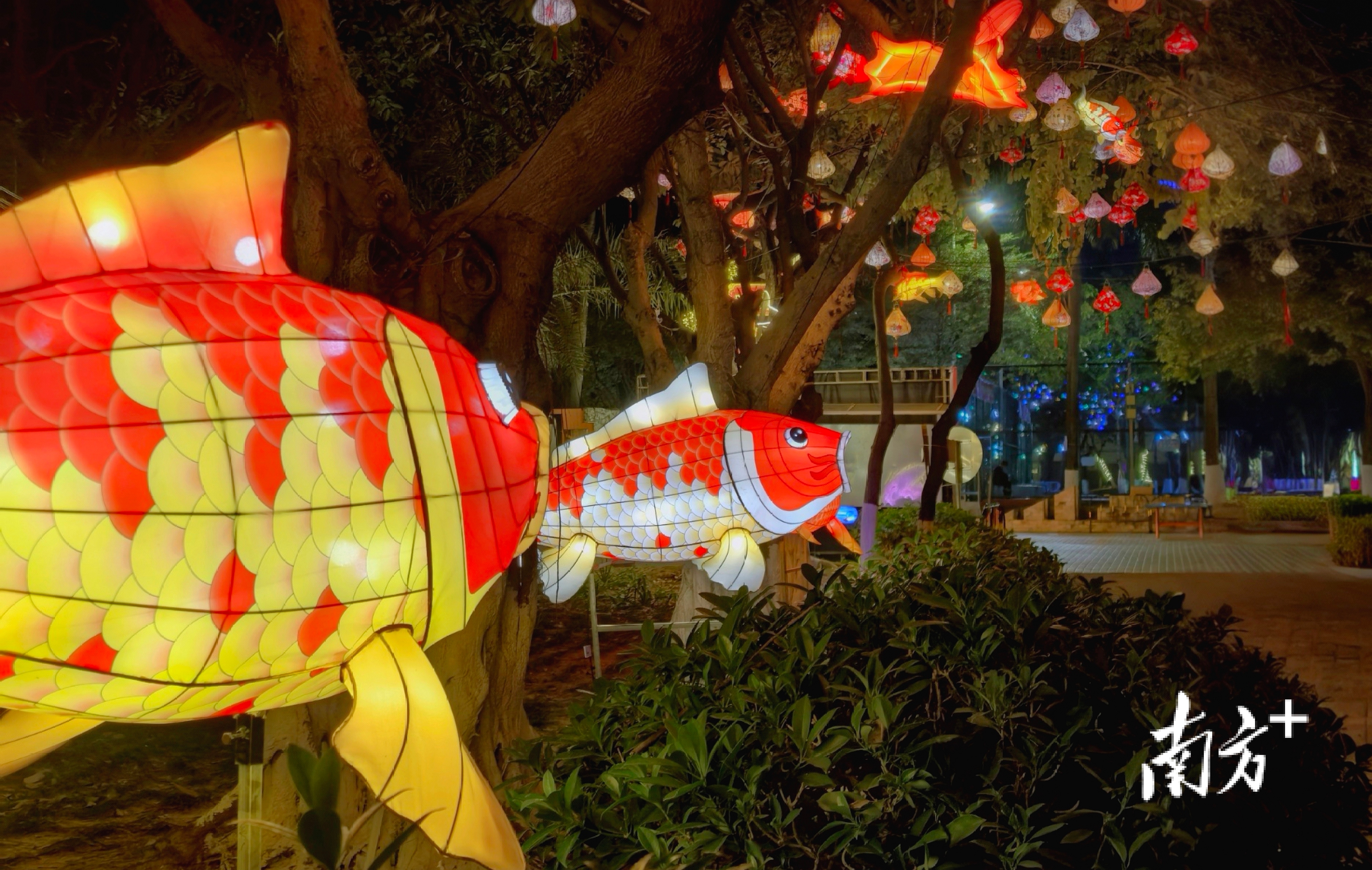 步入国风鱼灯主题区,满眼皆是灵动婉转的中式韵味。枝头高挂的鱼灯随风轻摆,鳞光闪闪、姿态翩跹,仿佛游鱼跃入枝头,织就一片漫天鱼影的唯美景象。