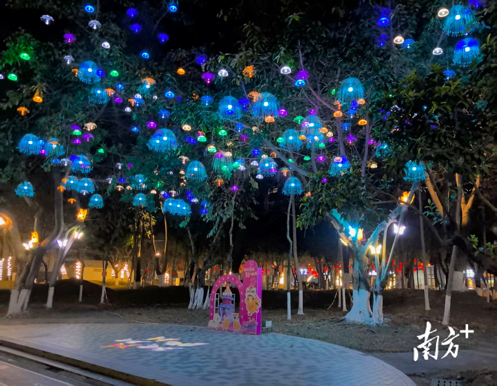 入口两旁的榕树被精心装点,吉祥彩带缠绕枝桠,寓意新一年福气缠绕、万事顺遂;枝间点缀玲珑鱼灯,树下是成群软萌水母小灯,光影交织间,刚入园就被浓浓年味紧紧包裹。