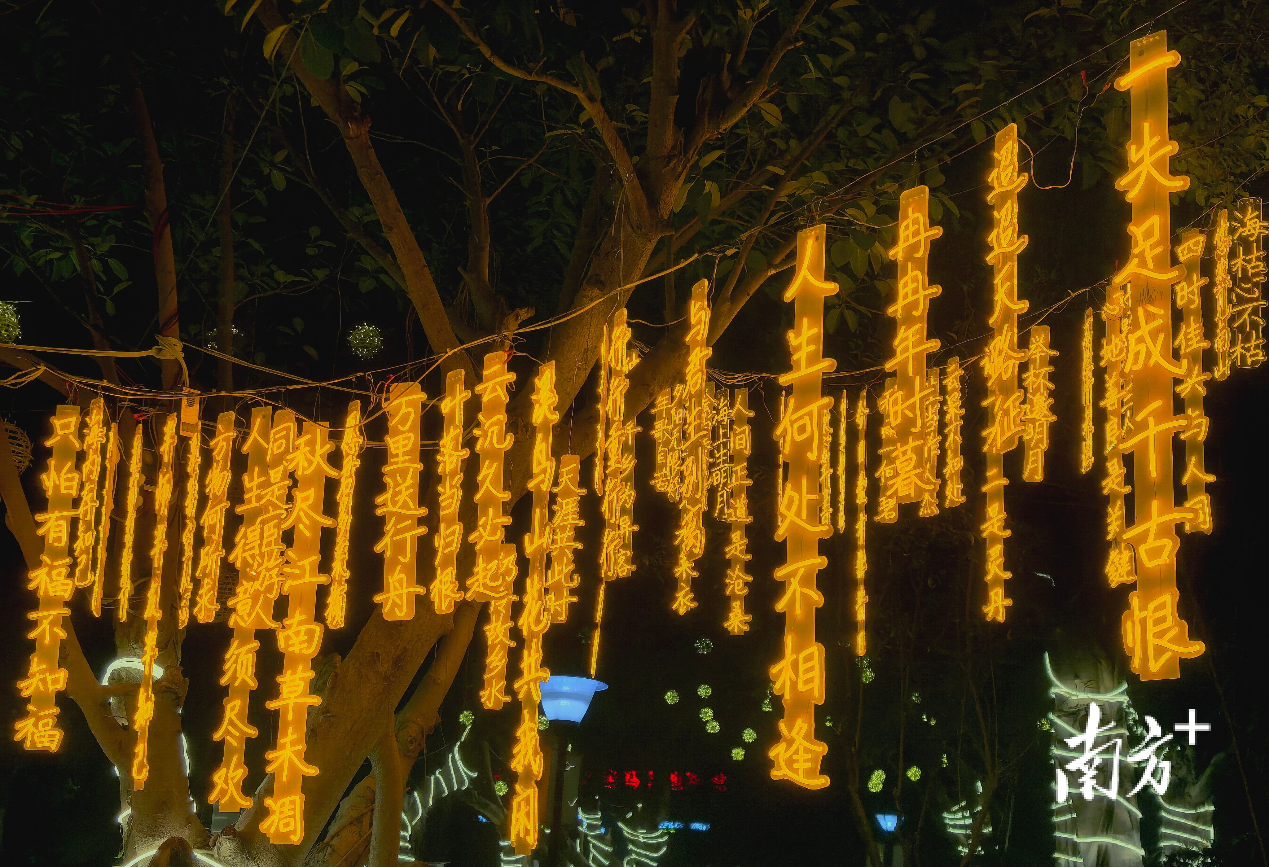 环湖步道的枝桠间,缠绕着柔美的藤灯,蜿蜒绵长、光影温润,将整个环湖路线装点得诗意盎然。湖光、灯影、诗词、鱼韵在此完美交融。