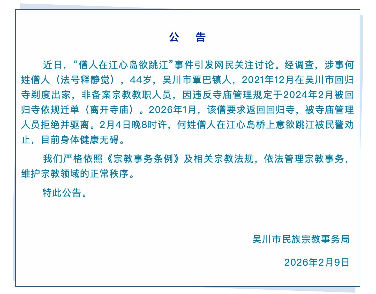 2月9日,湛江市吴川市民族宗教事务局发布公告称,近日,“僧人在江心岛欲跳江”事件引发网民关注讨论。经调查,涉事何姓僧人(法号释静觉),44岁,吴川市覃巴镇人,2021年12月在吴川市回归寺剃度出家,非备案宗教教职人员,因违反寺庙管理规定于2024年2月被回归寺依规迁单(离开寺庙)。2026年1月,该僧要求返回回归寺,被寺庙管理人员拒绝并驱离。2月4日晚8时许,何姓僧人在江心岛桥上意欲跳江被民警劝止,目前身体健康无碍。