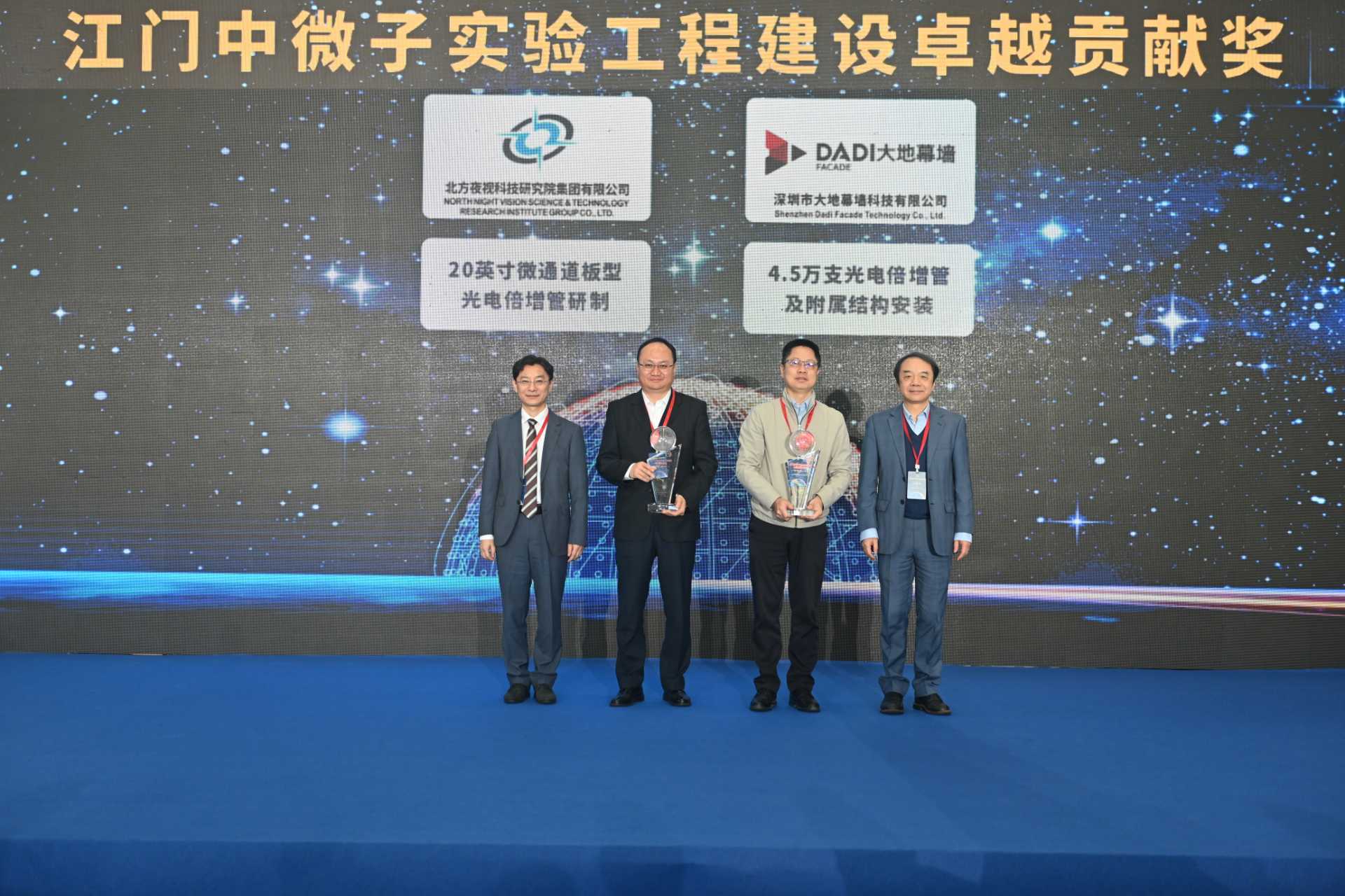 2026年1月18日,深圳大地与夜视院集团均获江门中微子实验工程建设卓越贡献奖。李国星(右二)、赵鹏(左二)上台领奖,王贻芳(右一)、曹俊(左一)颁奖 南方+ 张梓望 许舒智 拍摄