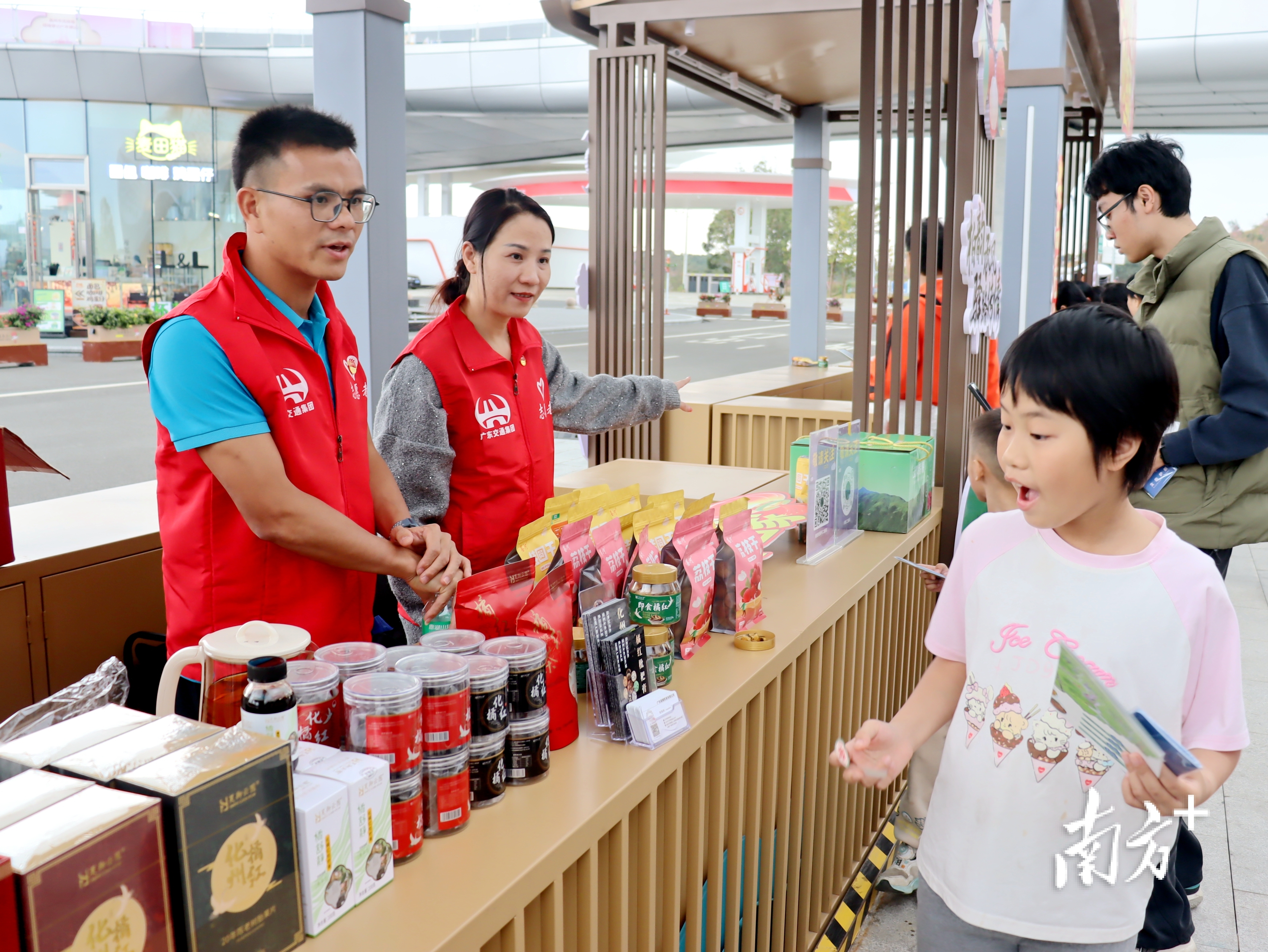 服务区西区广场前,荔枝干、龙眼干、化橘红、玛莎莉番薯等茂名特色农产品展销区吸引众多游客驻足。工作人员一边忙着招呼游客品尝,一边忙着手机屏幕里的直播推介。