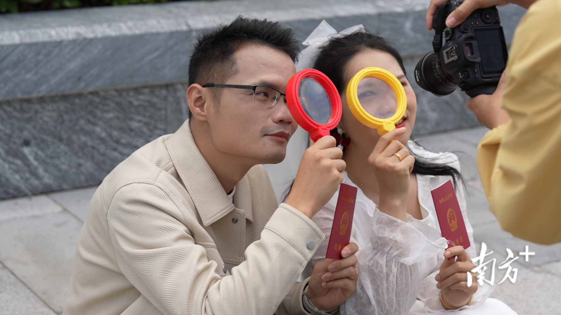 “把‘红本本’往前推,看镜头。”一对手里拿着结婚证的新人,在摄影师的指引下变换各种姿势拍照。