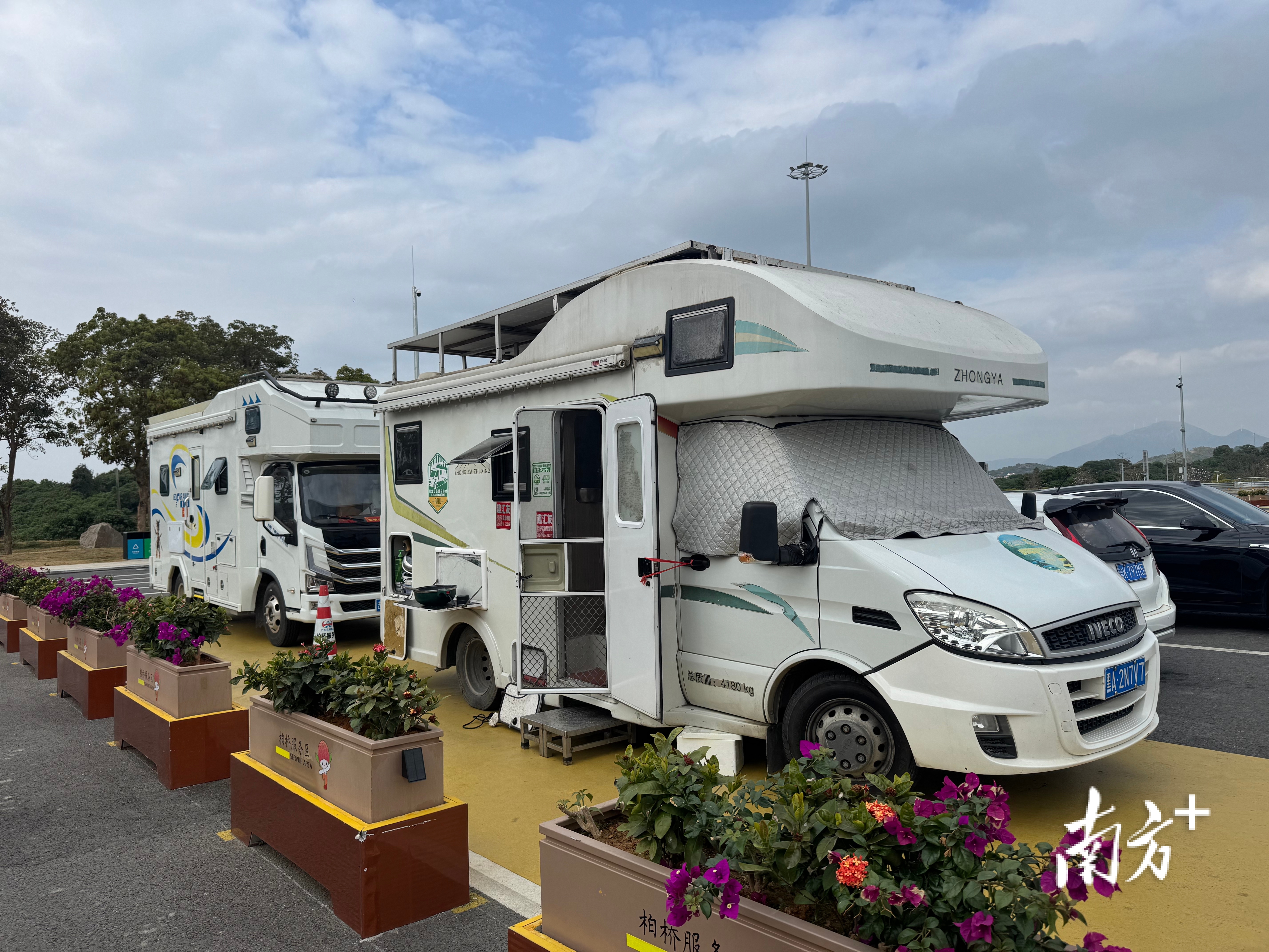 夫妻两人都已年近64岁,玩房车十几年,年年南下。今年原本要返程,从新闻报道里看到茂名新修的服务区像景区公园,临时拐了进来。